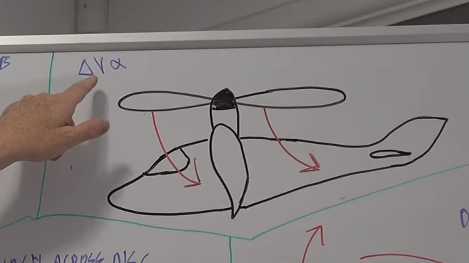 On the right of the whiteboard, is delayed wash. This is simply the time it takes for air leaving the main wing to hit the tail wings, and results in an increasing tendency to pitch upwards as a result.