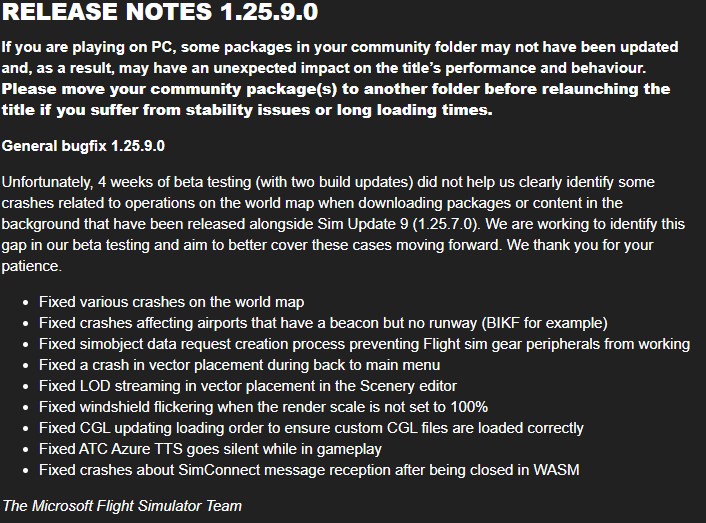 For PC users of MSFS, some packages in the community folder may have been excluded from the update, which may negatively impact MSFS’s performance and behavior. Asobo advises all users to move their community package to another folder before relaunching the title, especially if they suffer from stability issues or untimely loading times.
