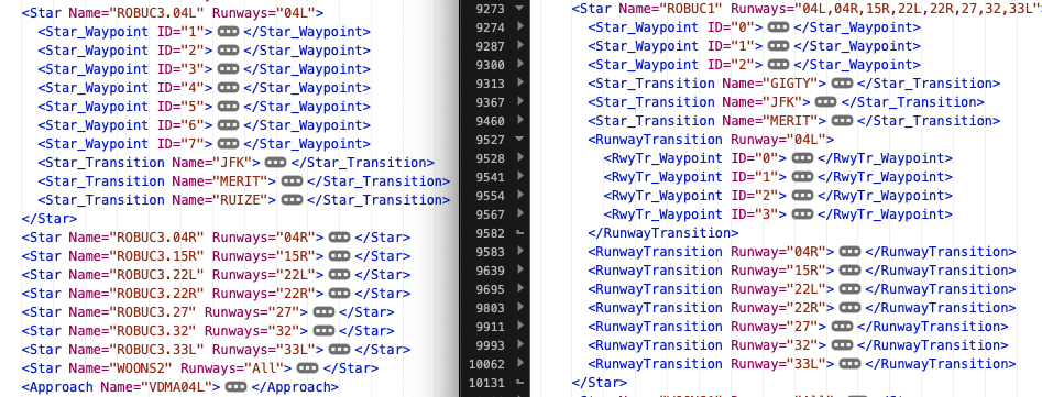 “I wrote a program to go through all the files and log each unique occurrence of a data type, i.e. “Star”  “Sid”. “Sid_Transition”, “Approach”, etc.  After I had that list (because I couldn’t find any spec), I set about programming the FMS….for a few years.  All was pretty well.  THEN….somewhere towards the end, we loaded up the same XML format dataset…but this time by Aerosoft, thinking “hey, lets support both providers, since there are plenty users of each””