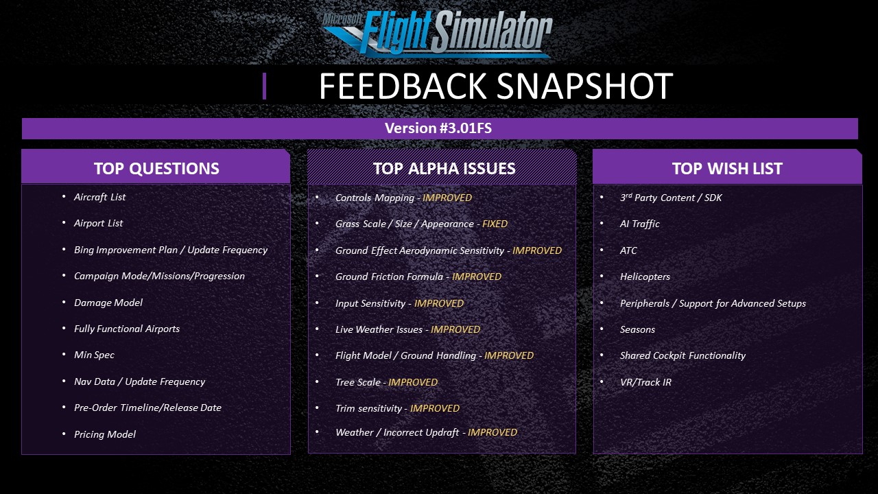 A new feedback snapshot was also provided, with the top issues regarding control mapping, grass effects, various details to do with the flight dynamics, weather and some environmental queries. Most of the have been addressed or fixed according to the infographic provided.