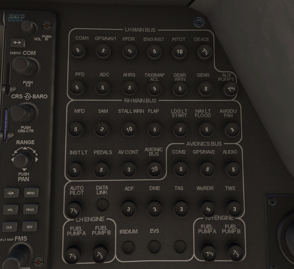 The voter panel is where the pilot can manage what ECU controlling what engine. In normal operations this is done automatically but in the case of a bad situation the pilot can switch ECUs using the two switches on the outside part of the panel. The two buttons on the inside labeled ‘ECU test’ are used during the runup. These buttons will disconnect the engine from both of the ECUs. When this button is pushed you want to ensure that the the respective engine doesn’t die. in the case of a dual ECU failure (this could be caused by electrical issues, computational glitches, engine oddities, etc. so they aren’t as rare as they may seem) then you would still want running engines. As you can tell, the level of detail that Aerobask has put in to the systems in this aircraft is outstanding. This still isn’t an exhaustive list! There are other systems like the anti-ice system and the MD302 that are modeled to the same level of detail as described in the systems above. Overall, Aerobask scores an absolutely astounding 15 out of 15 possible points on systems.
