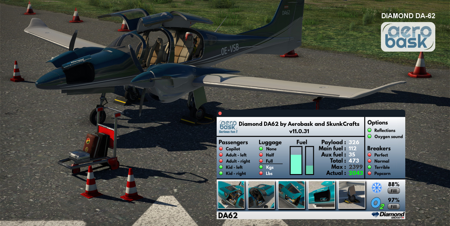 Beginning with the visuals, the DA62 continues Aerobask’s repute for stylistic visuals, one of the visual highlights is that the team has nailed the silver metallic red paint effect. Like the Cessna Dragonfly released earlier this week, the Flightmodel is done by the experts at X-Aerodynamics, very closely matching real performance, based on public data. With native VR support right out of the first release and a fully functional 3d cockpit. Becoming the norm here, FMOD sounds are integrated but expanded to simulate Doppler and Flanger effects. Laminar’s Garmin G1000 is integrated into the 3d cockpit, other system features include the oxygen system, ice protection system and a Customised FADEC/ECU with test procedures Unique visuals include windshield effects and configurable pilots, passengers and baggage.