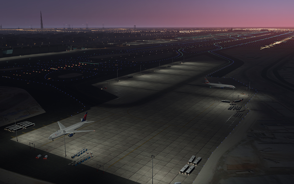 Dubai Airport by Aviotek Simulation Software also includes a simple rendition of the city’s skyline, including the world’s tallest building – the Burj Khalifa – and a local skydiving company’s airstrip.