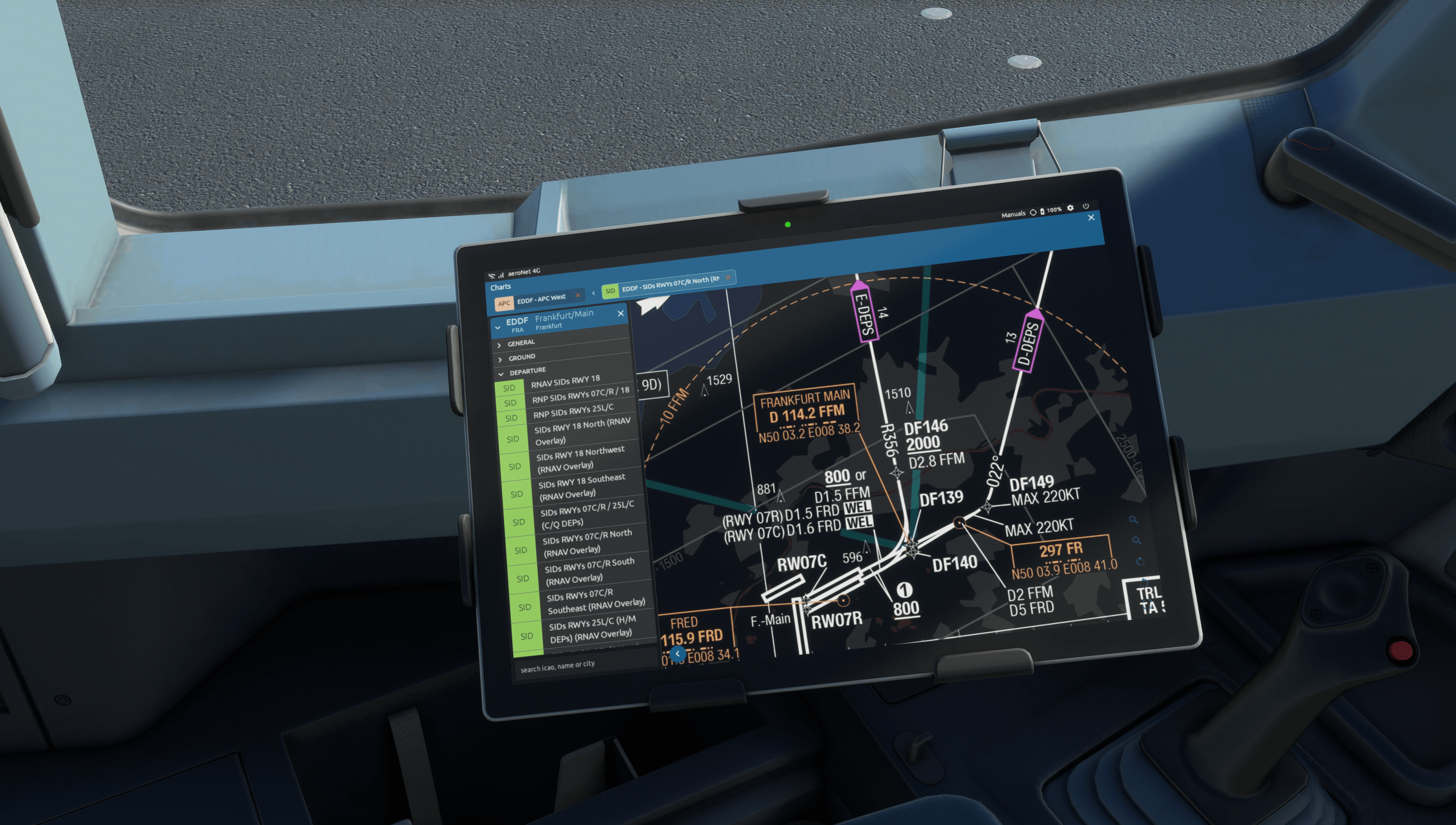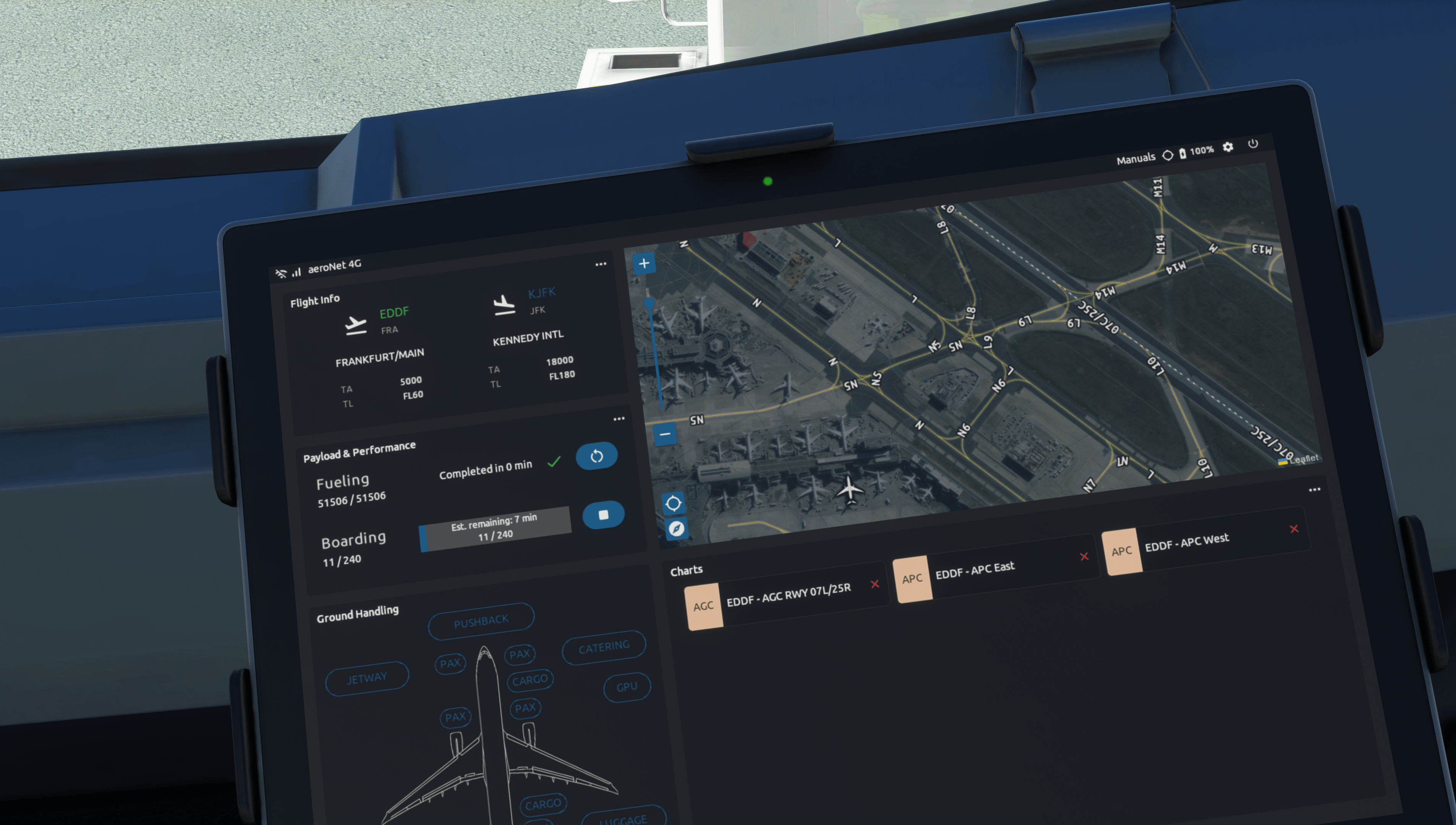 The following images show the integrated charts and the moving map, which help taxiing around complex airport layouts: