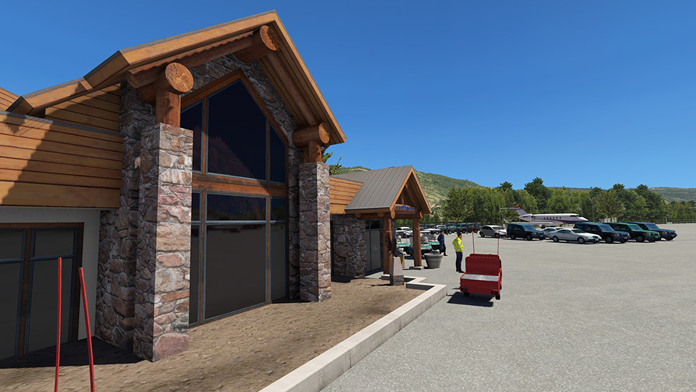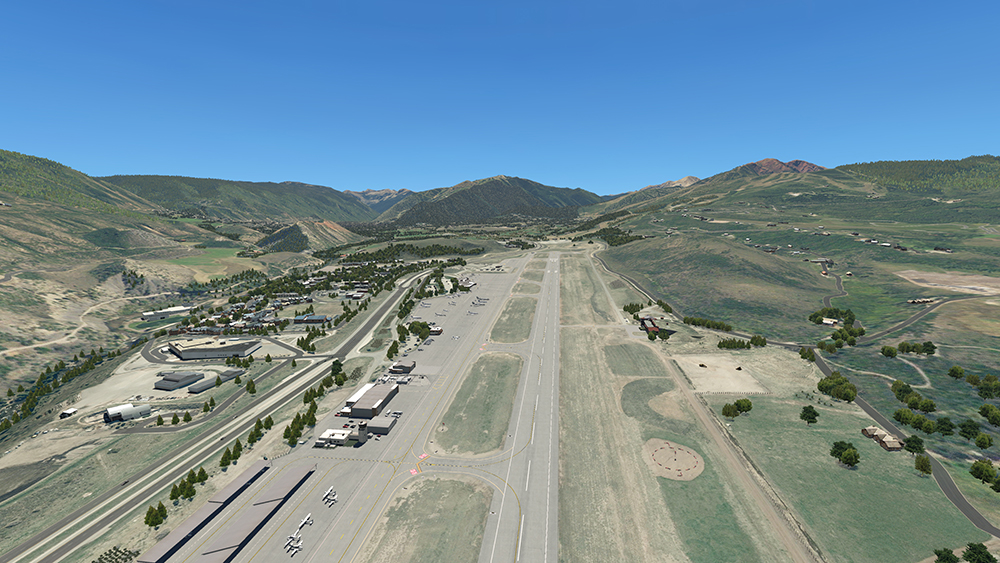 Up-to-date rendering of Aspen Pitkin County Airport (KASE), including extended runway and new taxiways, fire station (with Oshkosh Striker 1500), fixed-base operator, terminal and hangars