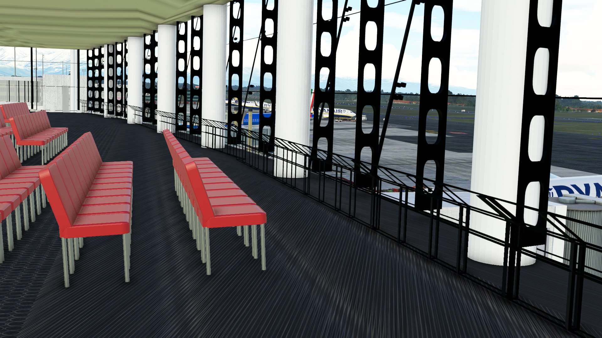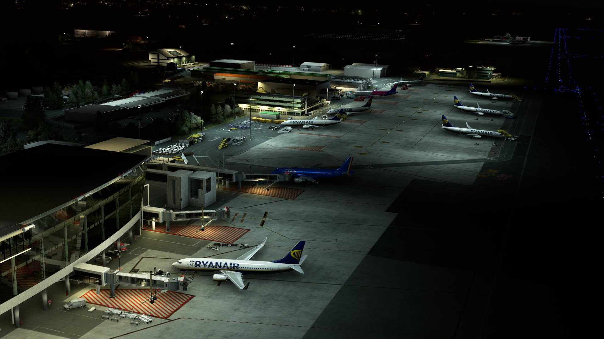 The scenery features an accurate rendition of the airport as it currently stands, with a modeled terminal with its interior, custom jetways, custom ground textures and markings, night lighting, along with landside objects and clutter.