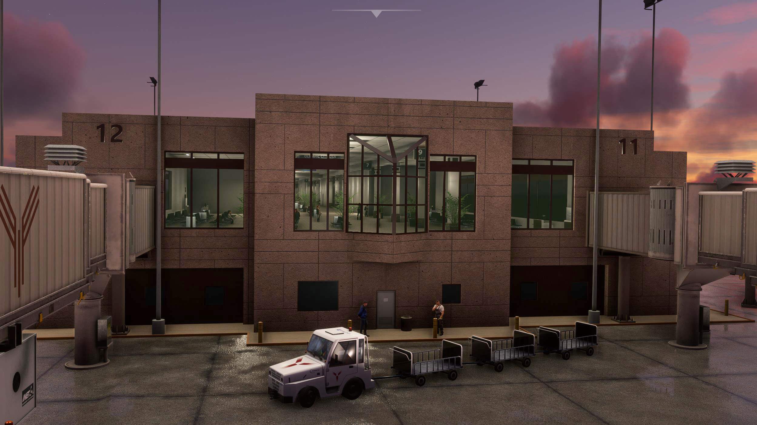 The scenery features an accurate rendition of the airport, with high-resolution ground textures, custom ground markings, animated jetways, a detailed terminal interior, landside buildings, and FSLTL compatibility.