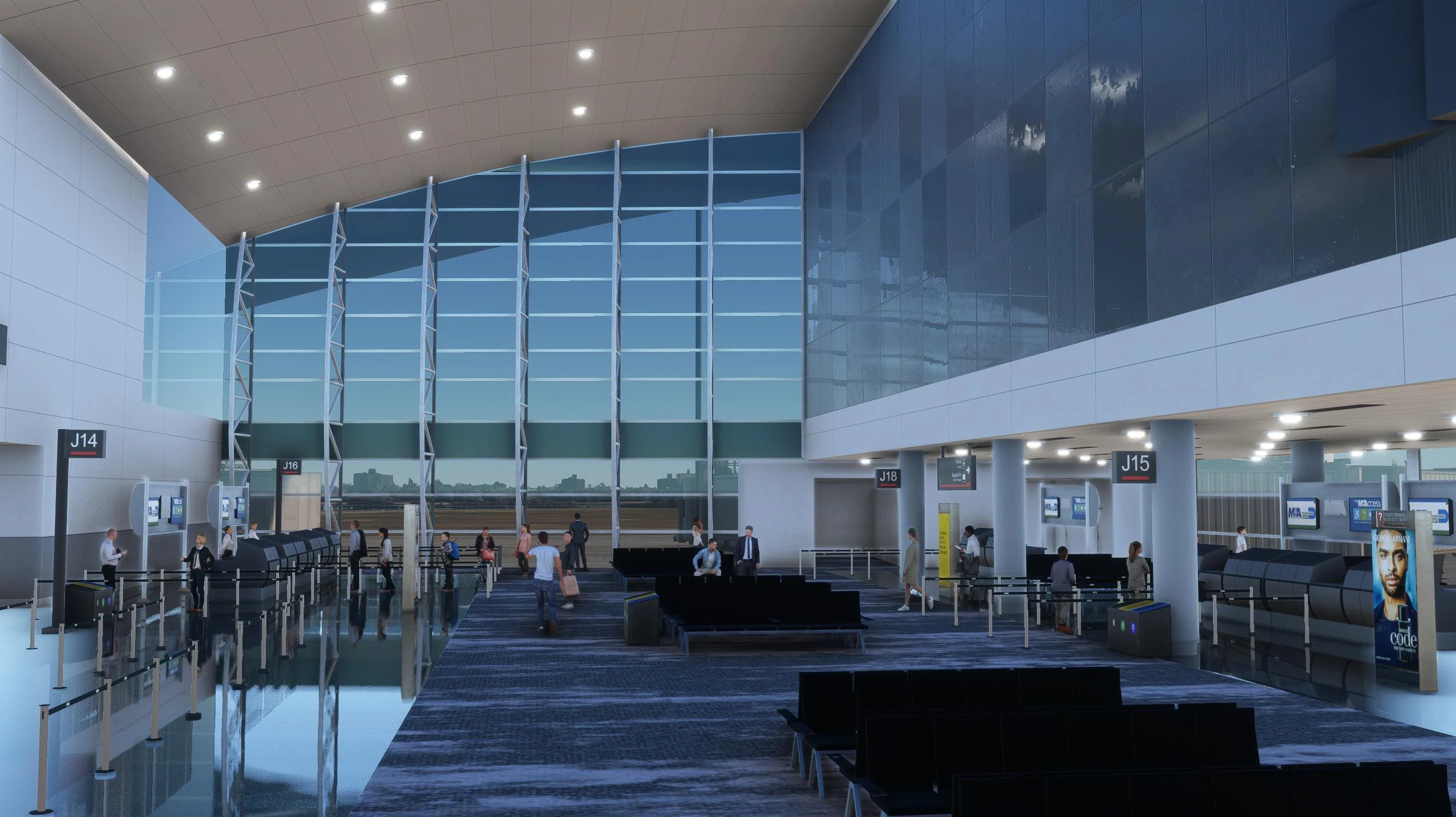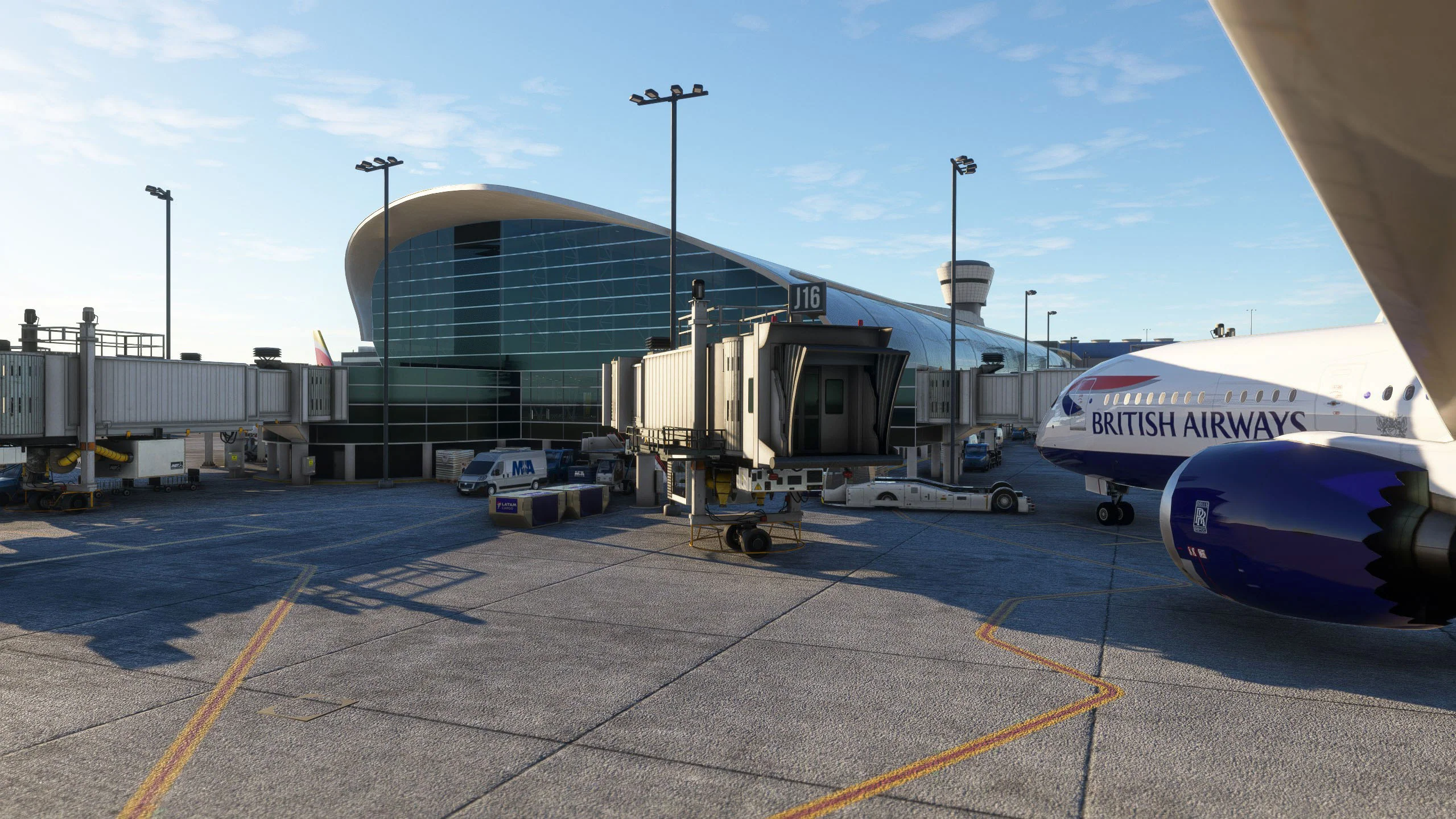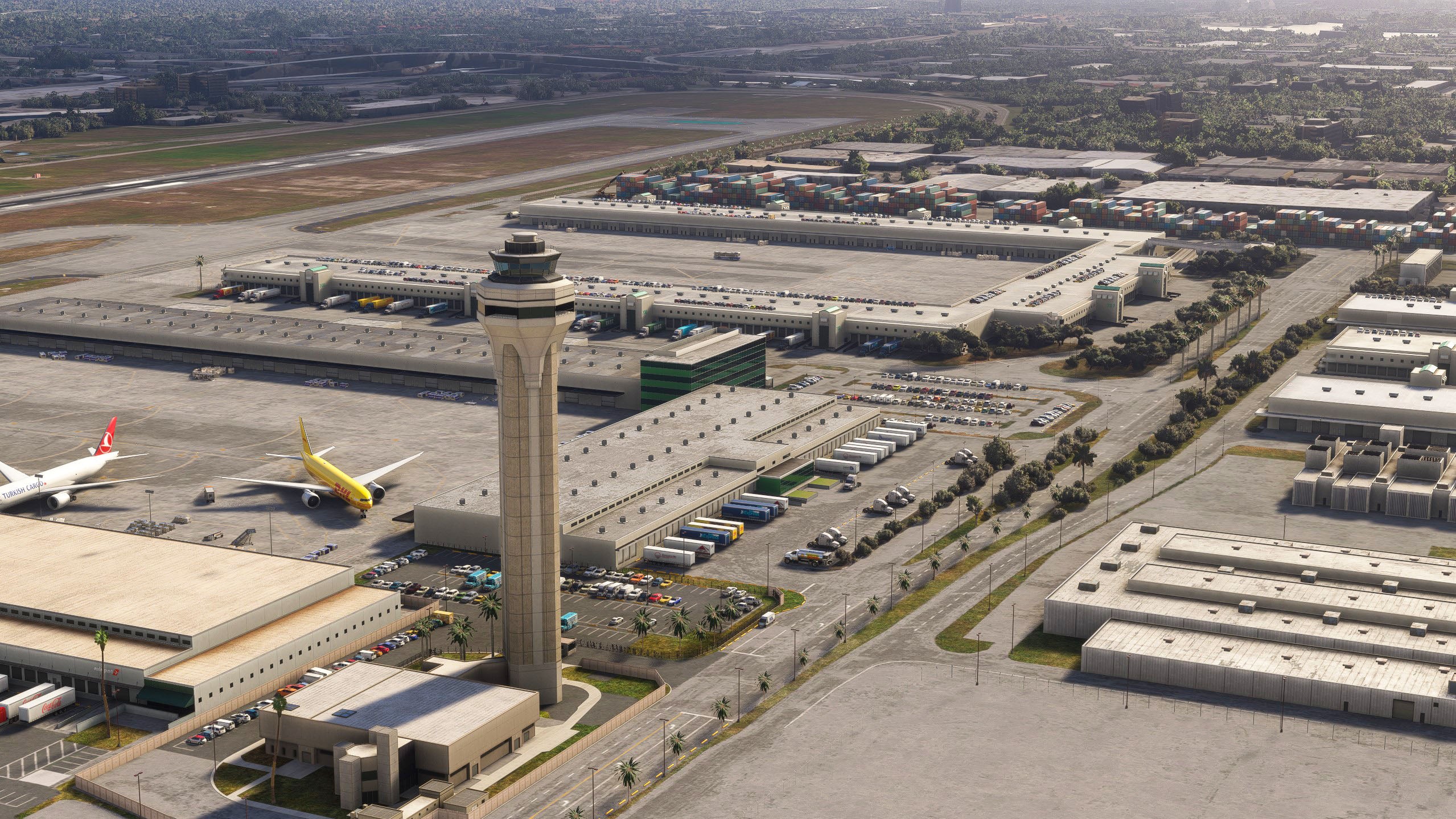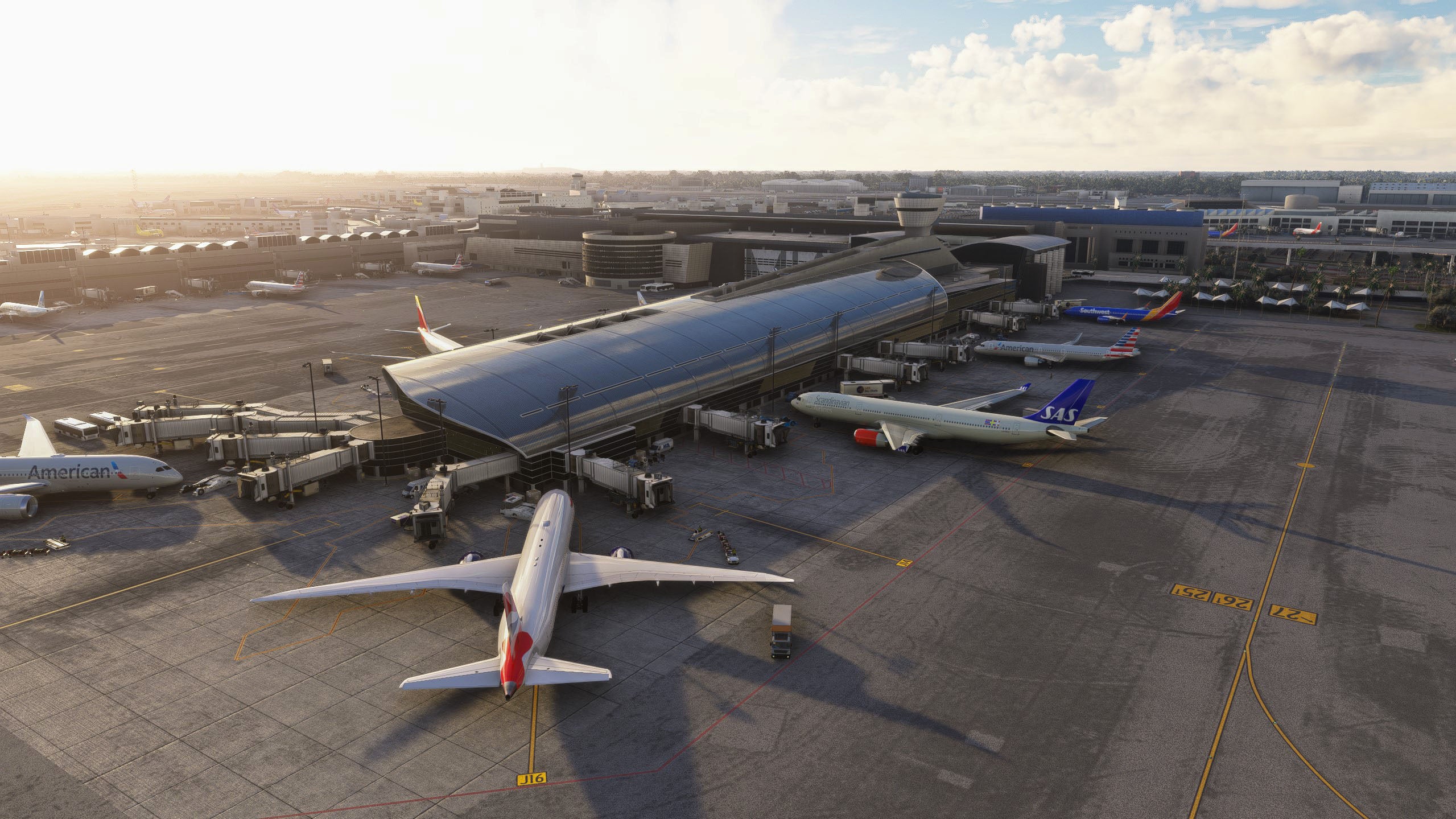 The scenery features an accurate rendition of the airport, with high-resolution custom ground textures, real-world ground dirt, a detailed terminal area, animated jetways, 60+ landside buildings, and more.