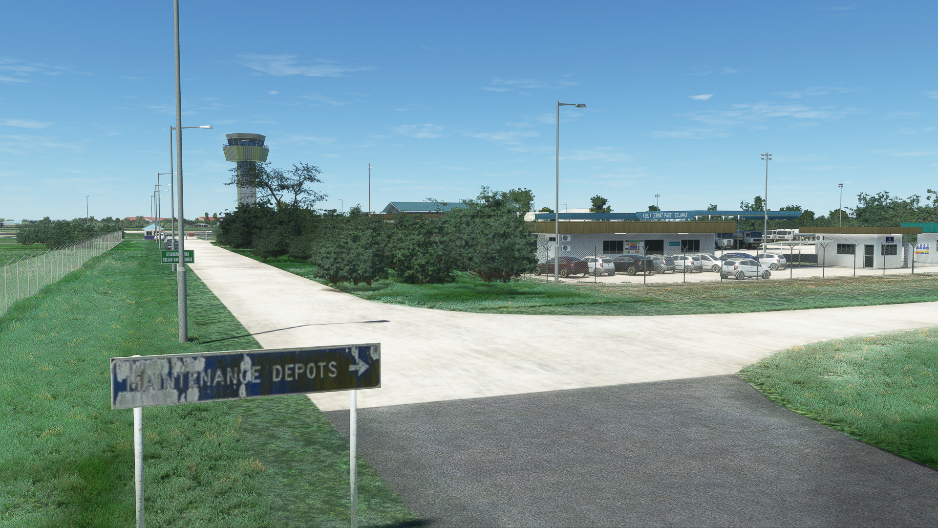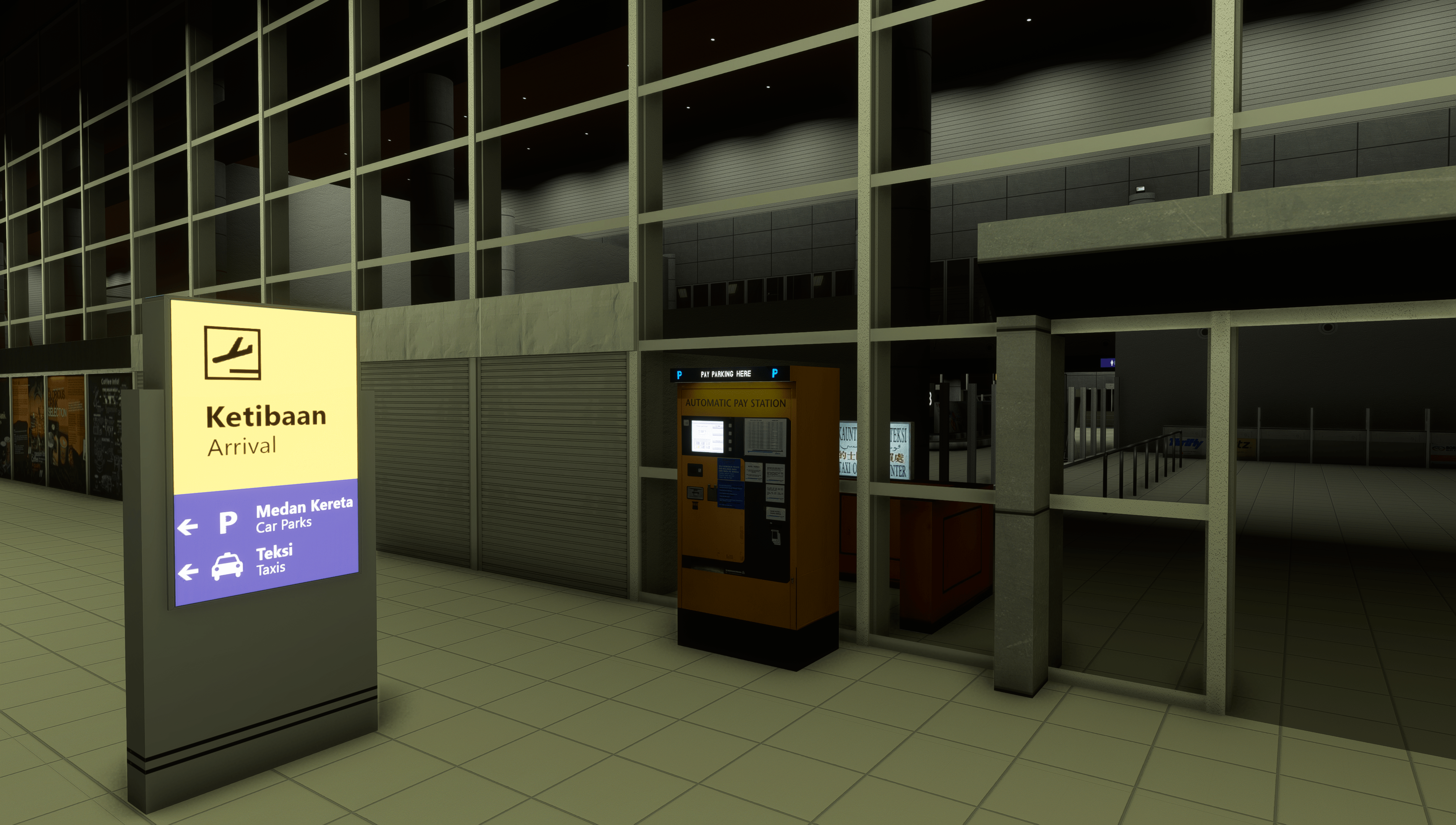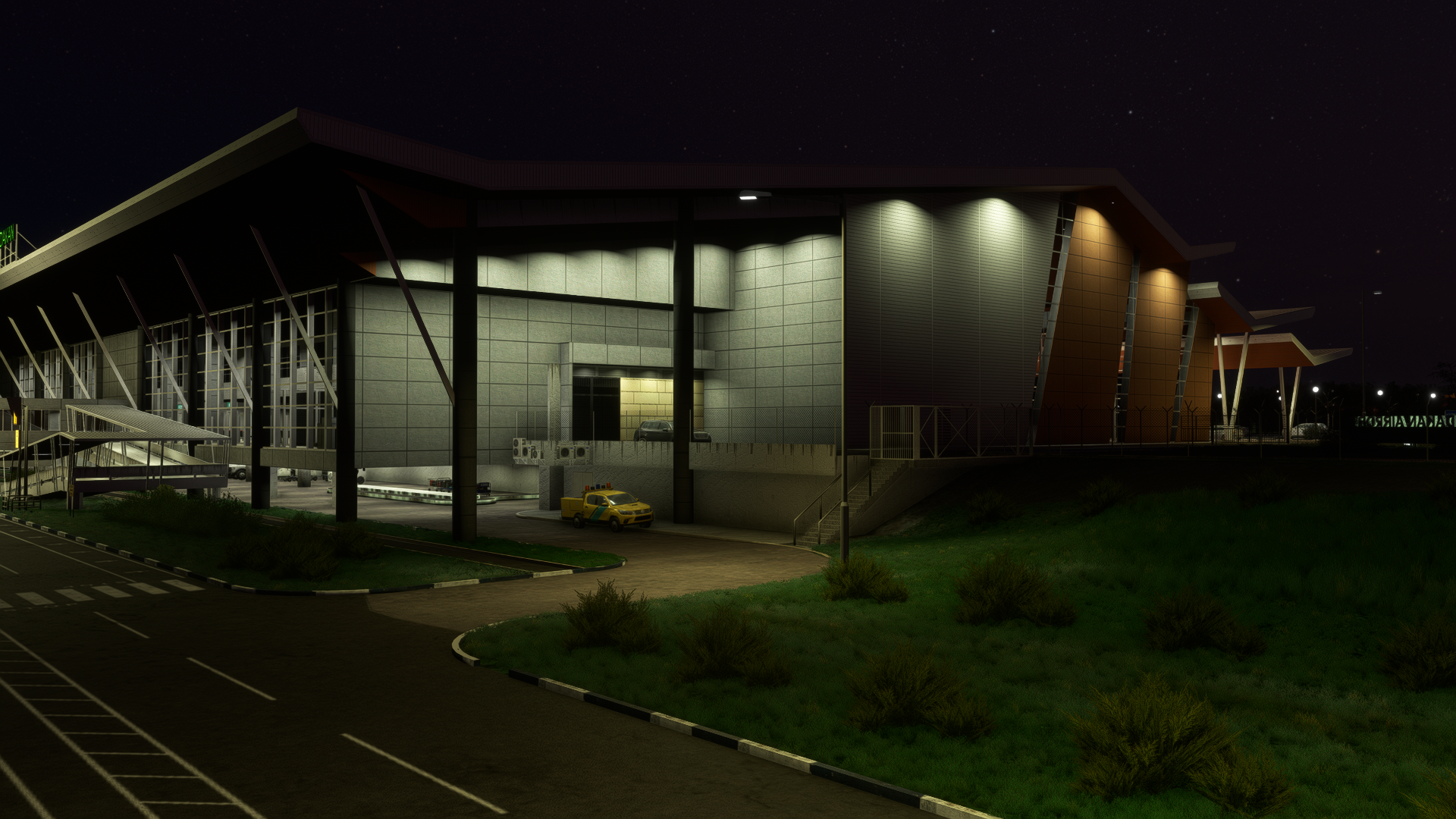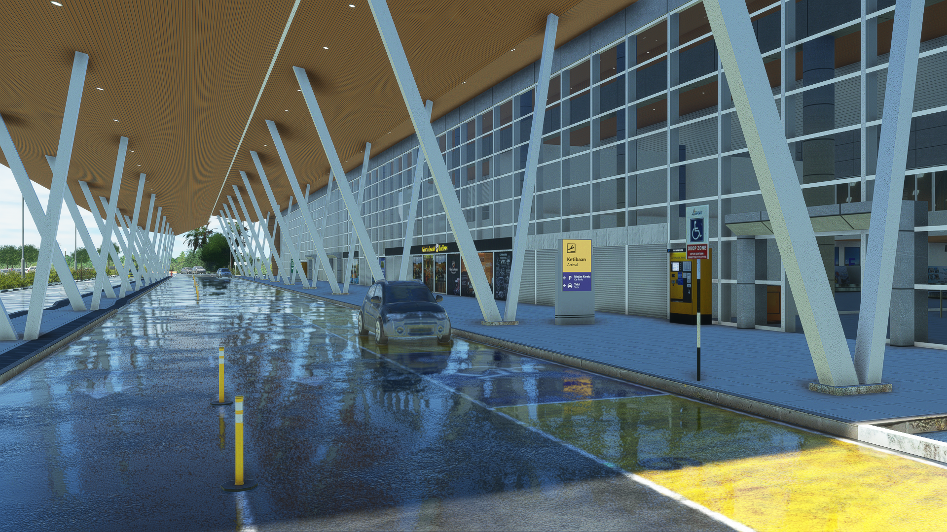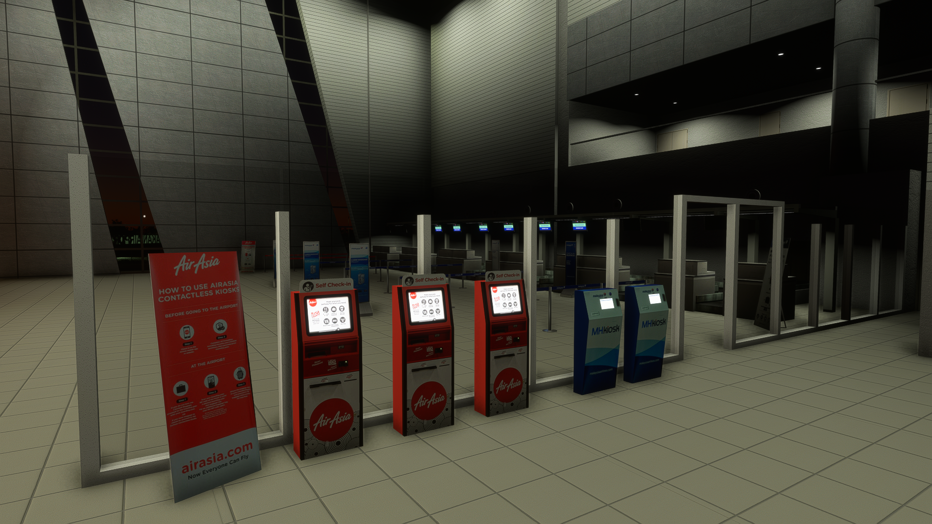 The scenery features an accurate rendition of the airport, with a fully modeled terminal (including interior), landside buildings, custom ground textures, custom ground markings, and a custom jetway model.