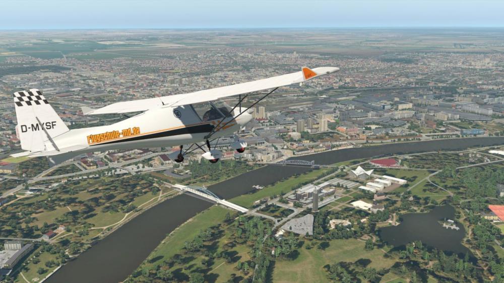 “The vFlyteAir model comes with 13 liveries and two panel variants (basic trainer panel + full panel incl. basic GPS, electronic attitude indicator and Rotax FLYdat engine monitor). We gave special attention to a trusty flight model which trys to resemble as much as possible what I experience in my real-world flights. We also gave a lot of attention to visual detail, esp. the different materials on the exterior: Wings are made both of fabric and plastic material, and they are semi-transparent; Igor and Walker captured this look in a quite awesome way (in my opinion at least).”