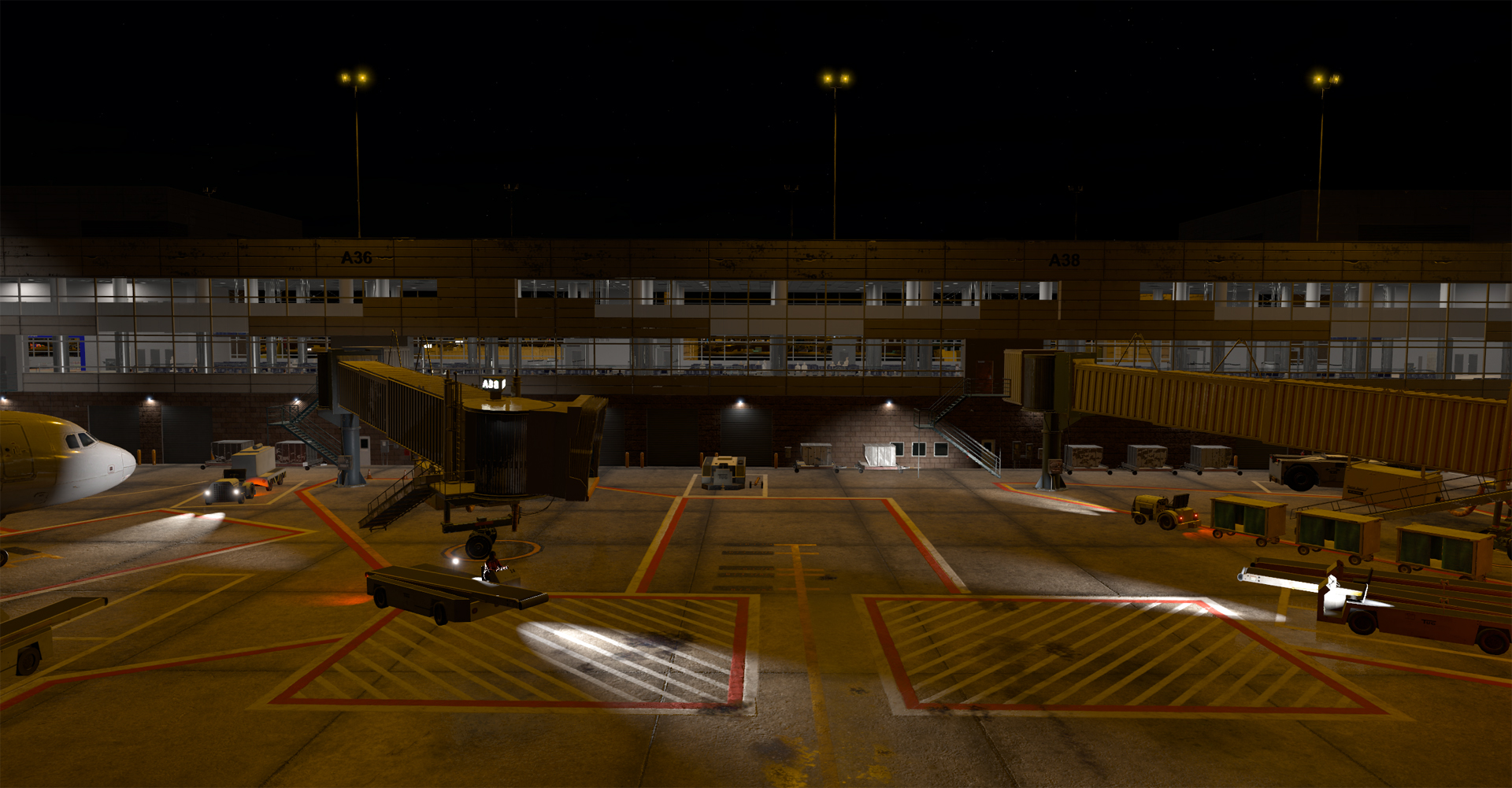 Version 2.0 – free to owners of the previous version – brings a high-quality rendition of the airport as of 2023, with an up-to-date ground layout, realistic terminal interiors with multiple points of interest, animated escalators, animated people (with varying density according to the time of day), windows on buildings that mimic the optics of real glass, PBR texturing, and performance-friendly optimization.