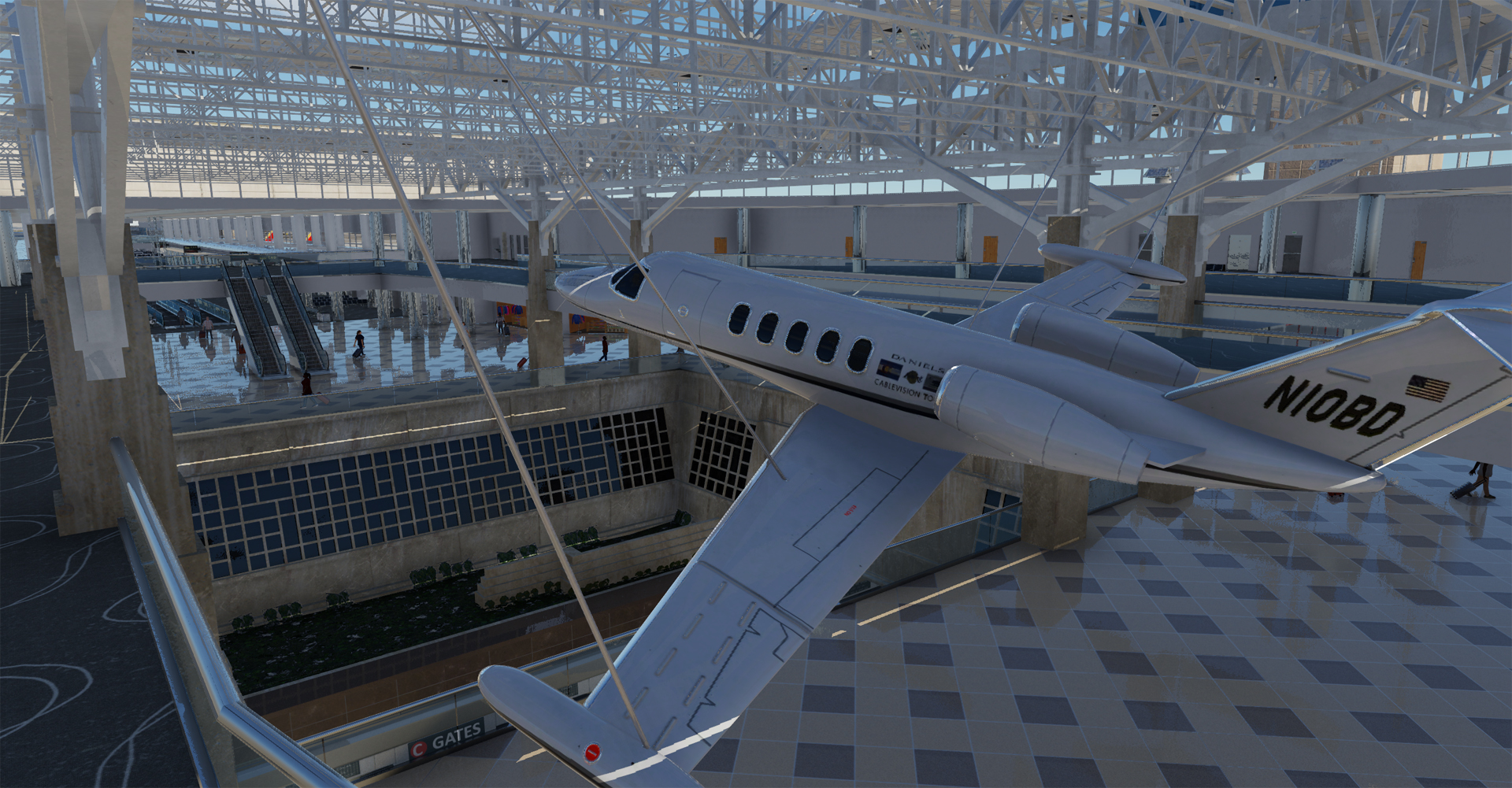 It uses their Living Scenery Technology plugin that warrants animated people, animated vehicles traveling at realistic speeds, animated electronic display boards on concourse B displaying time and temperature, variable AC fan blade speeds depending on temperature, and more.