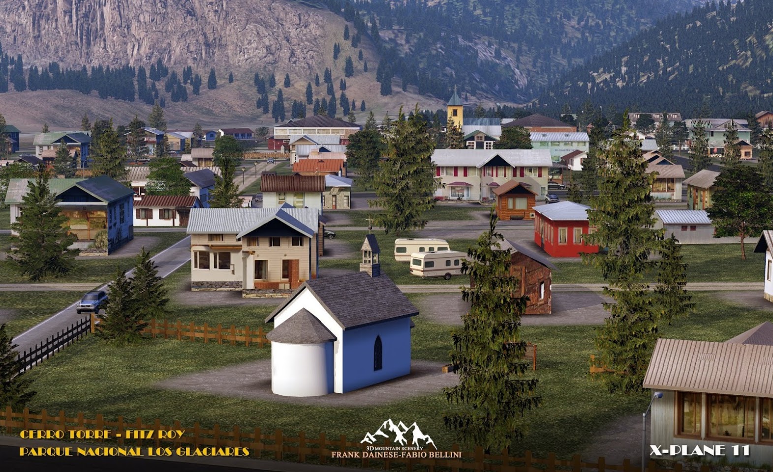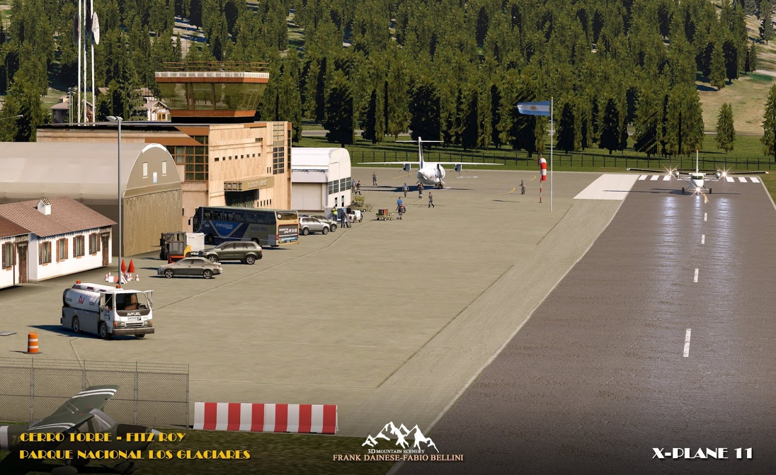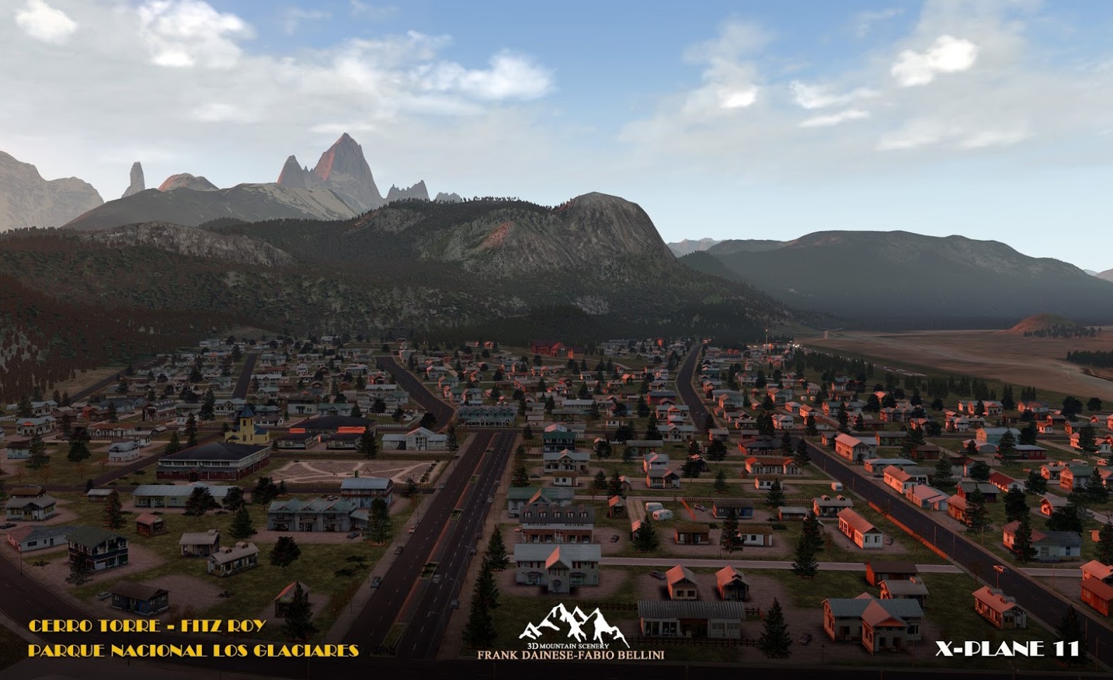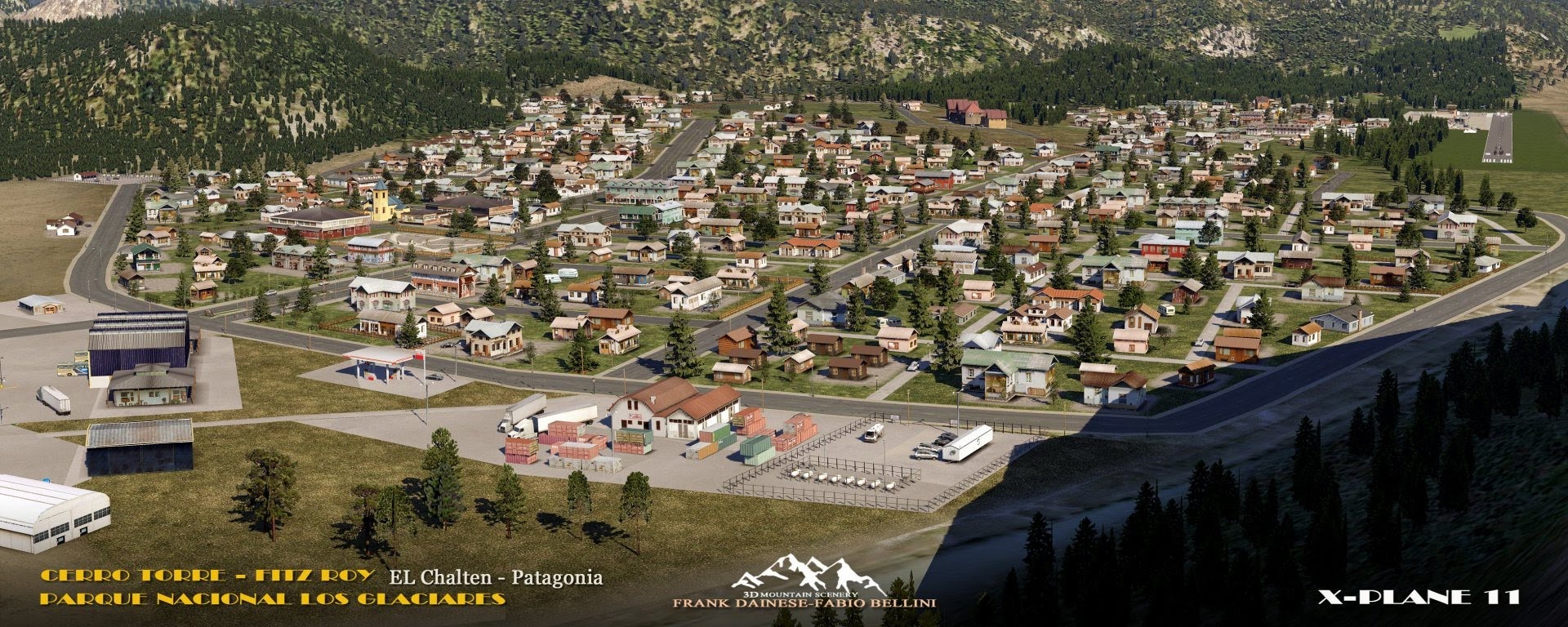 The scenery includes El Chalten Airport with a runway length of just 800 metres, as well as some helipads dotted around, mainly in the south.