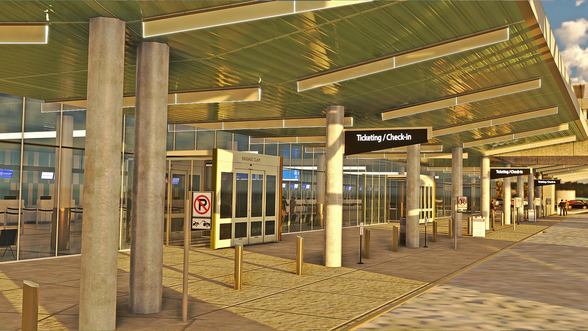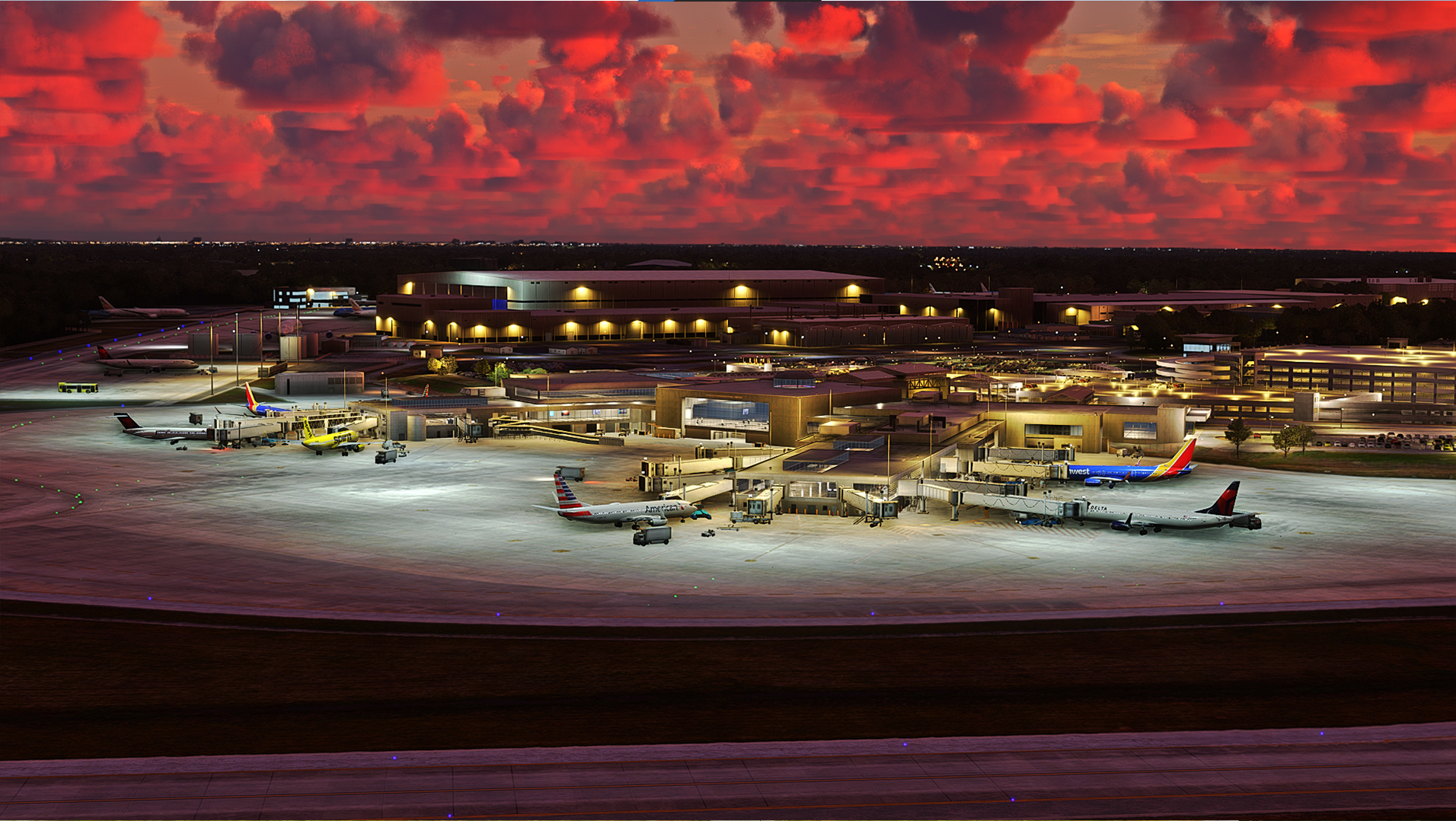 The scenery features an accurate rendition of the airport, with PBR textures, dynamic lighting, real ground markings, custom ground textures, custom jetways, and more.