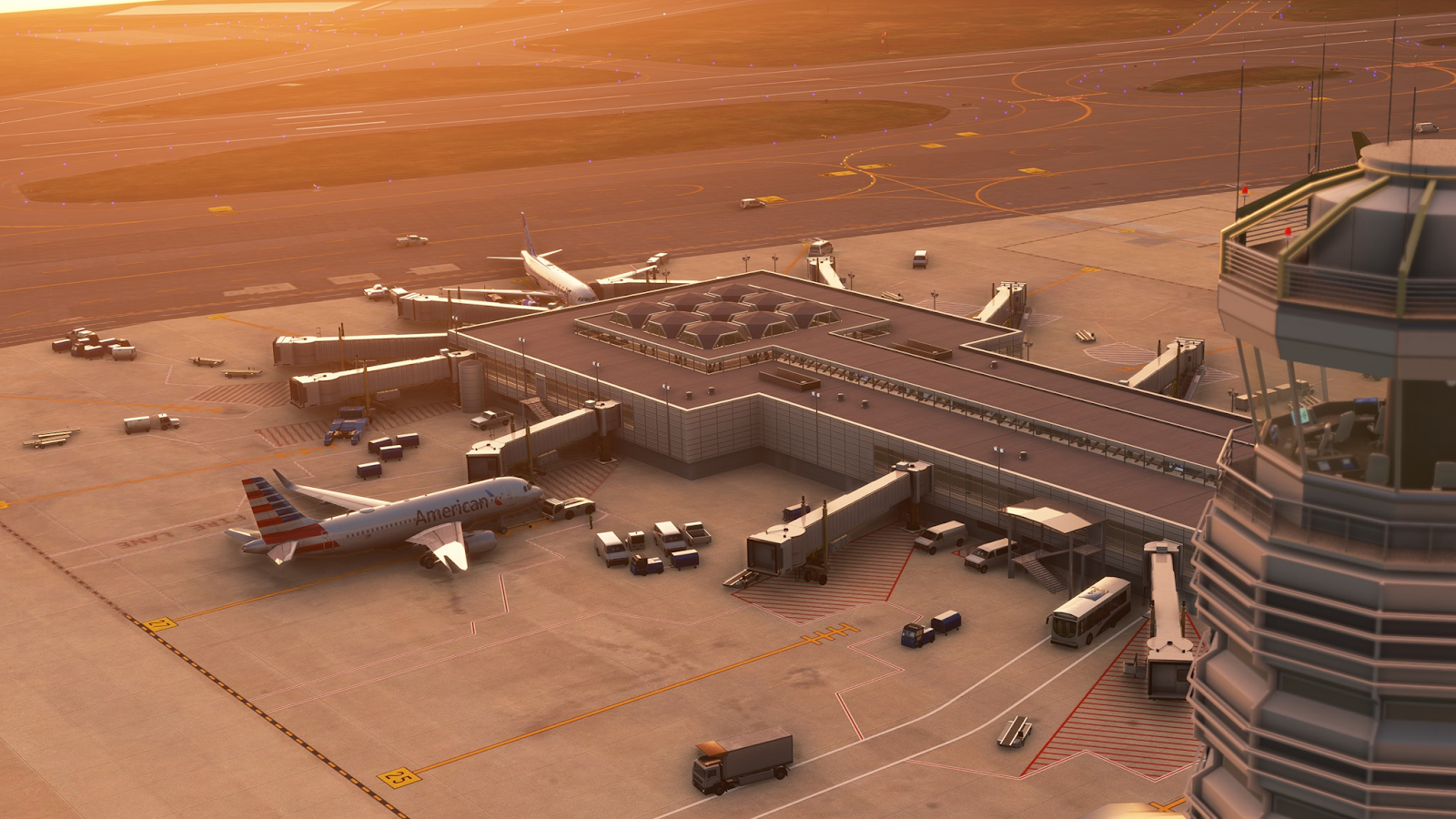 - Performance-friendly interior modelling at terminal buildings, control towers, and some hangars, static aircraft, advanced night lighting, custom animations, custom mesh, custom animated jetways