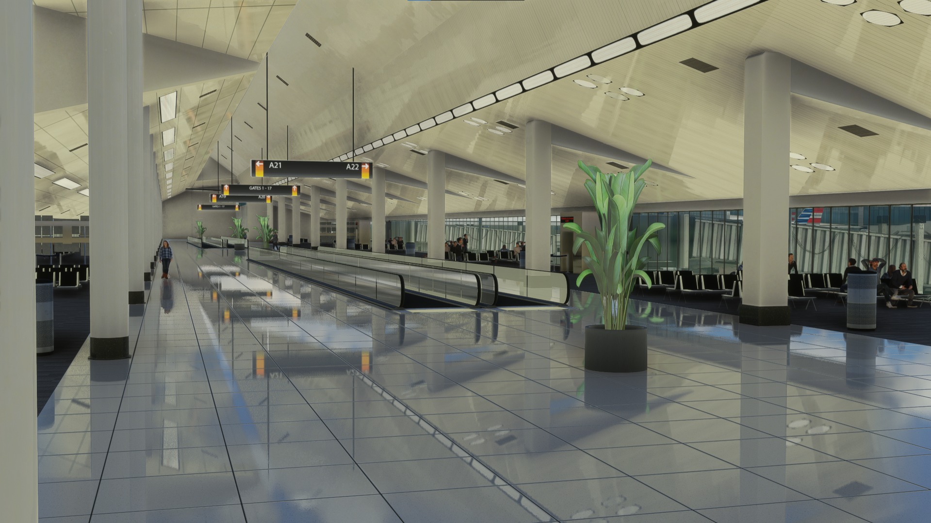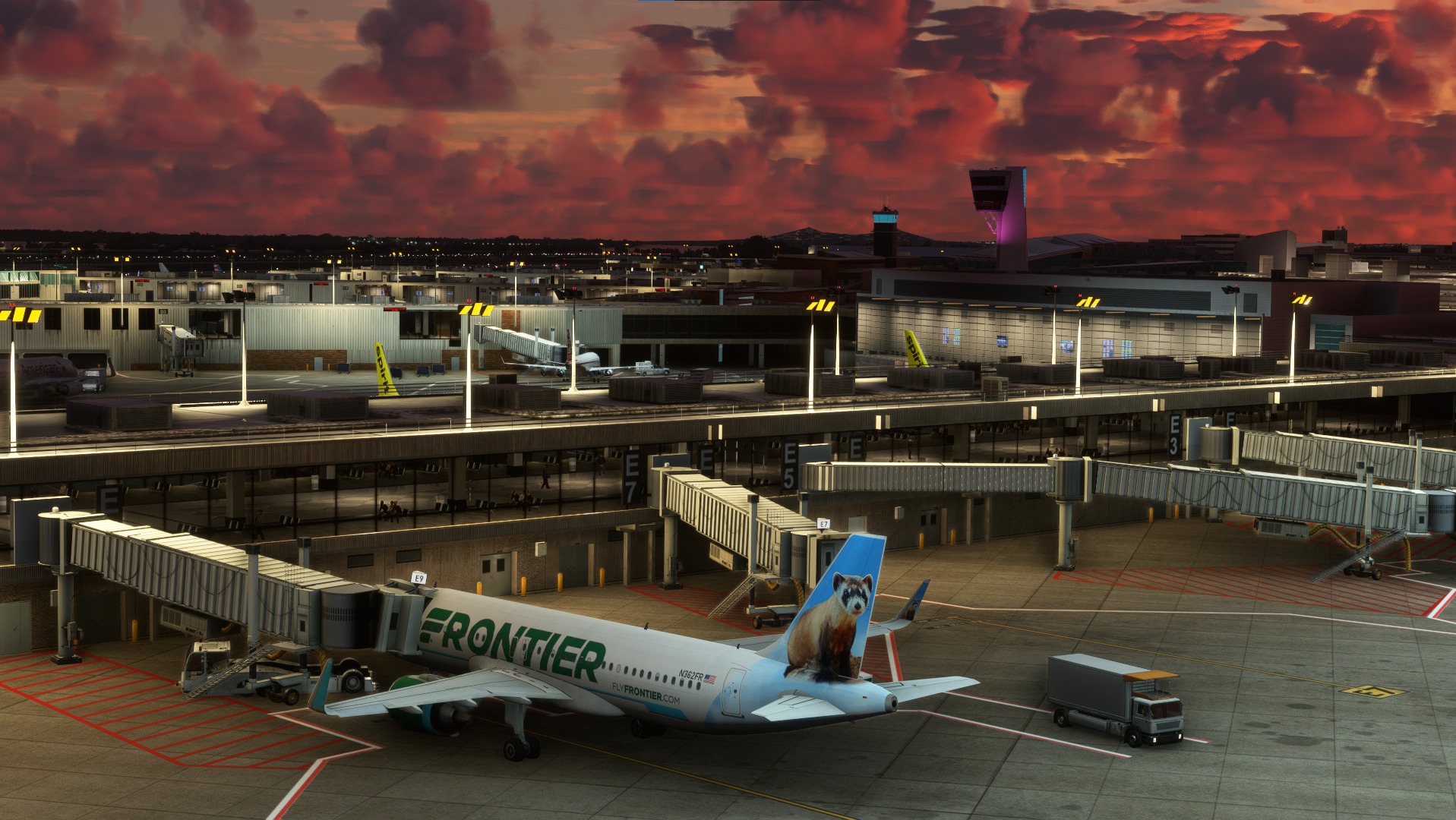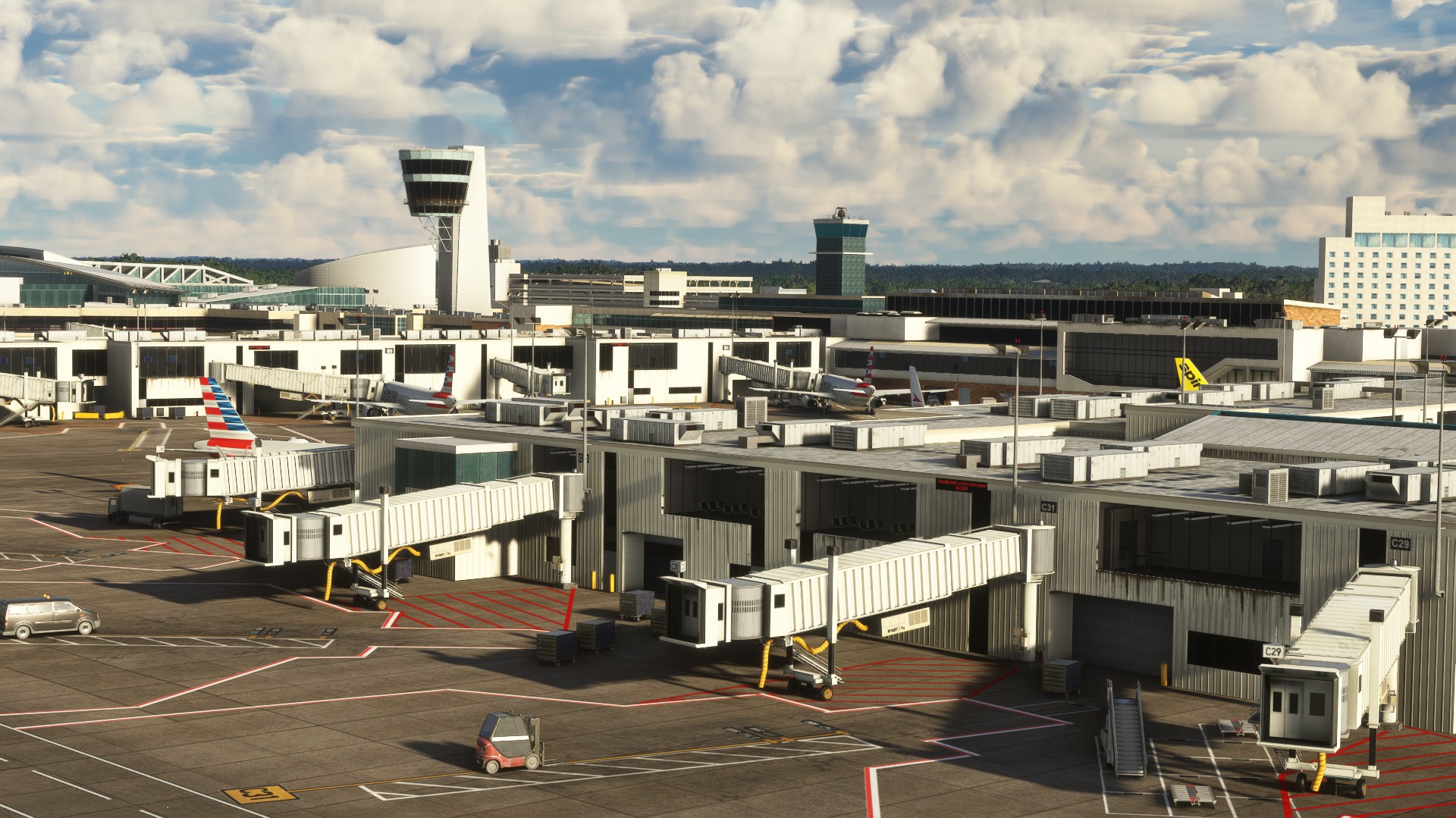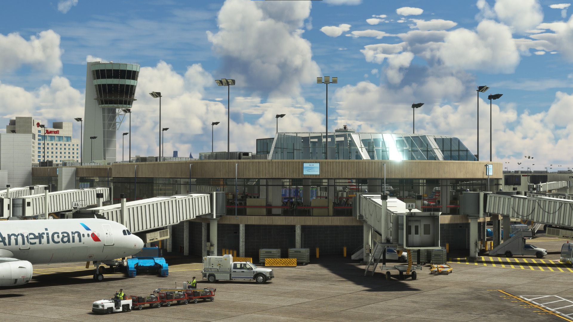 The scenery features an accurate rendition of the airport, with PBR textures, dynamic lighting, real ground markings, hand-crafted pavement textures, custom jetway, custom object animation, and AI airline parking codes.