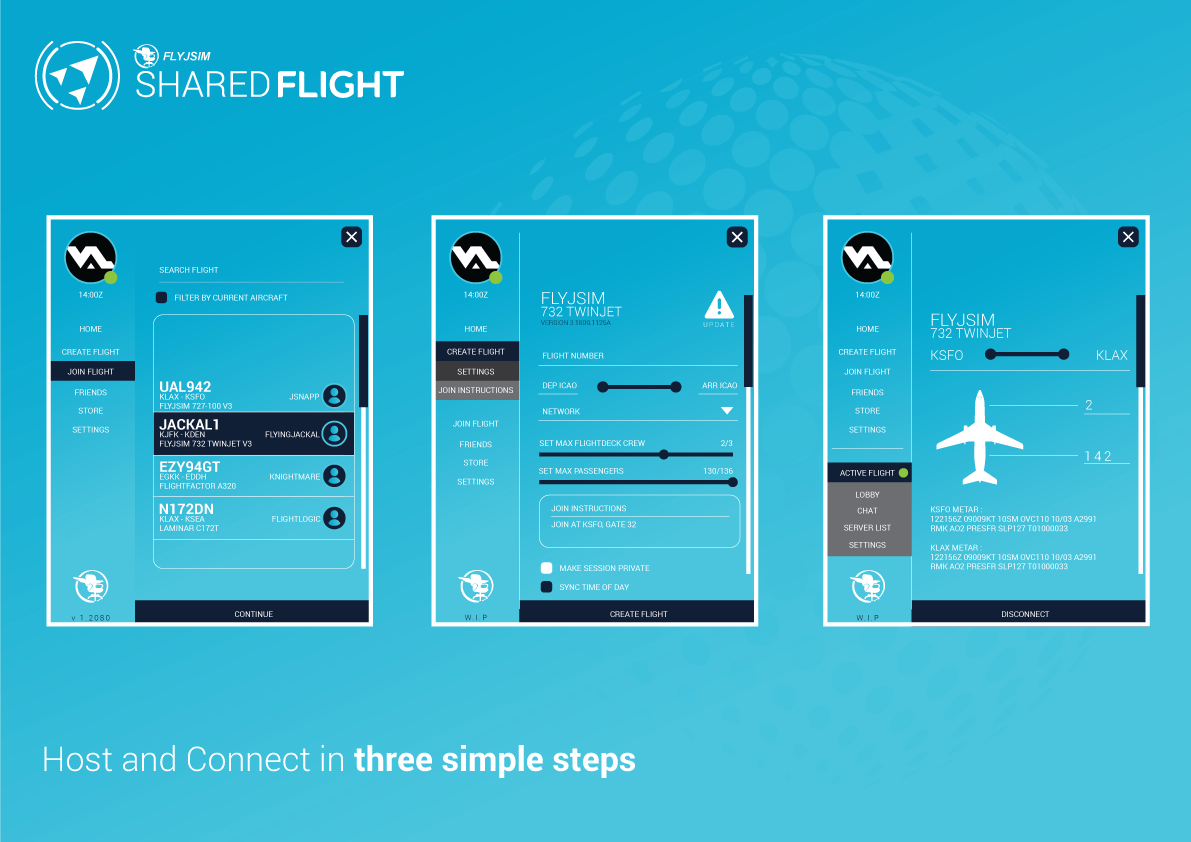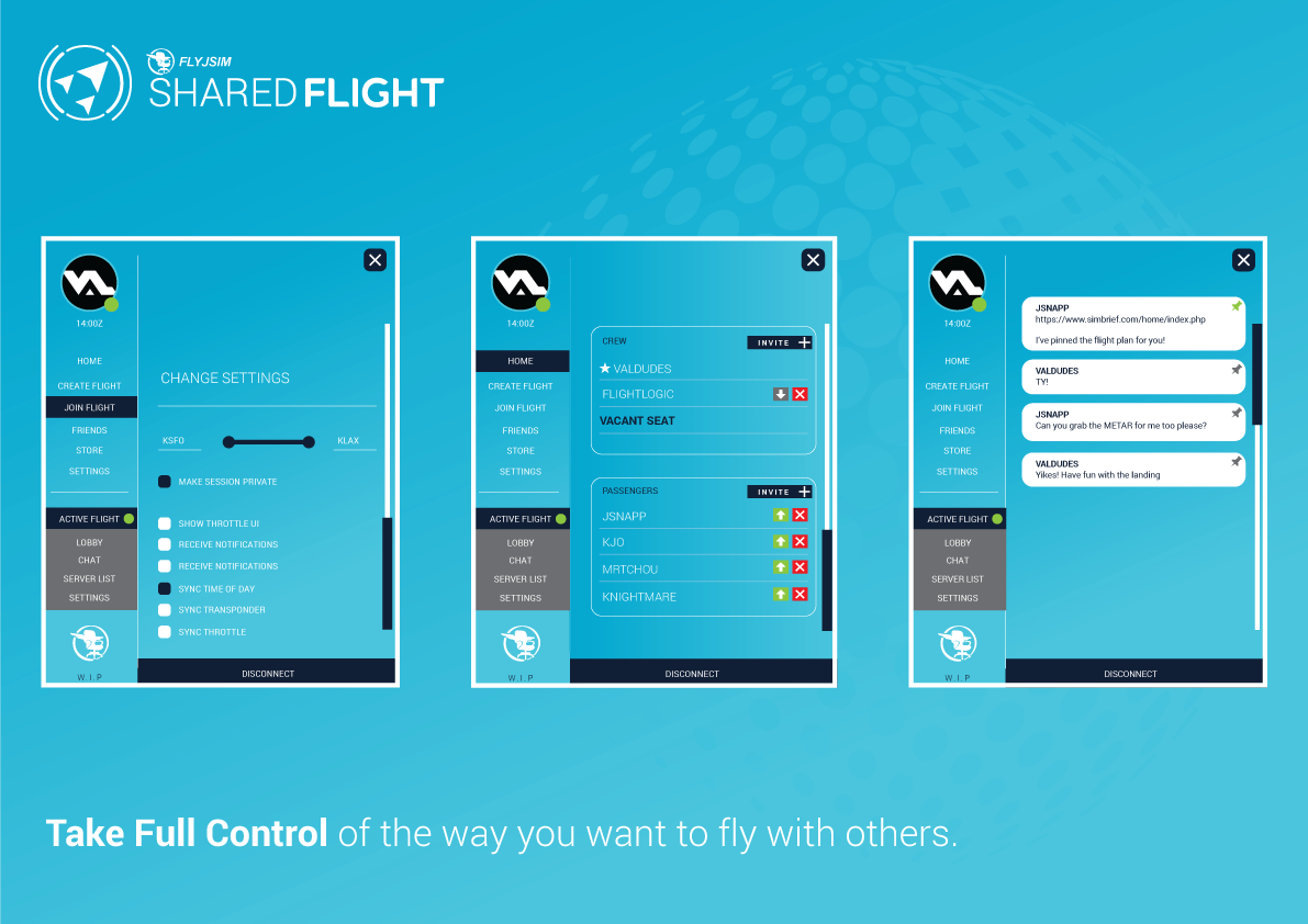 Shared Flight is incredibly easy to use, and we take care to automate as many functions for you in the background as possible. We’ve designed the application to allow you to connect/host a flight in the shortest amount of clicks as possible.