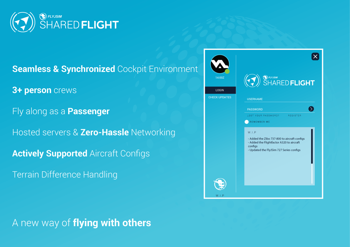 Today, after years in development, the developer has announced their newest product: Shared Flight. The plugin enables individuals to connect with others around the world and fly together in “popular and quality aircraft.” Billed as the ultimate shared cockpit tool, it sports a modern interface, support for passengers, seamless motion, ground clamping, and much more. It is even possible to fill an entire airliner with passengers and a full crew.