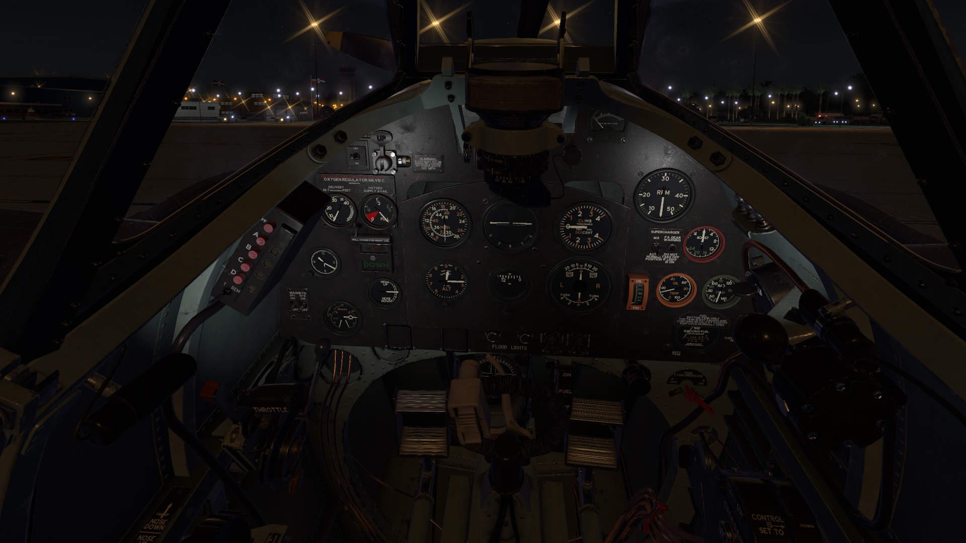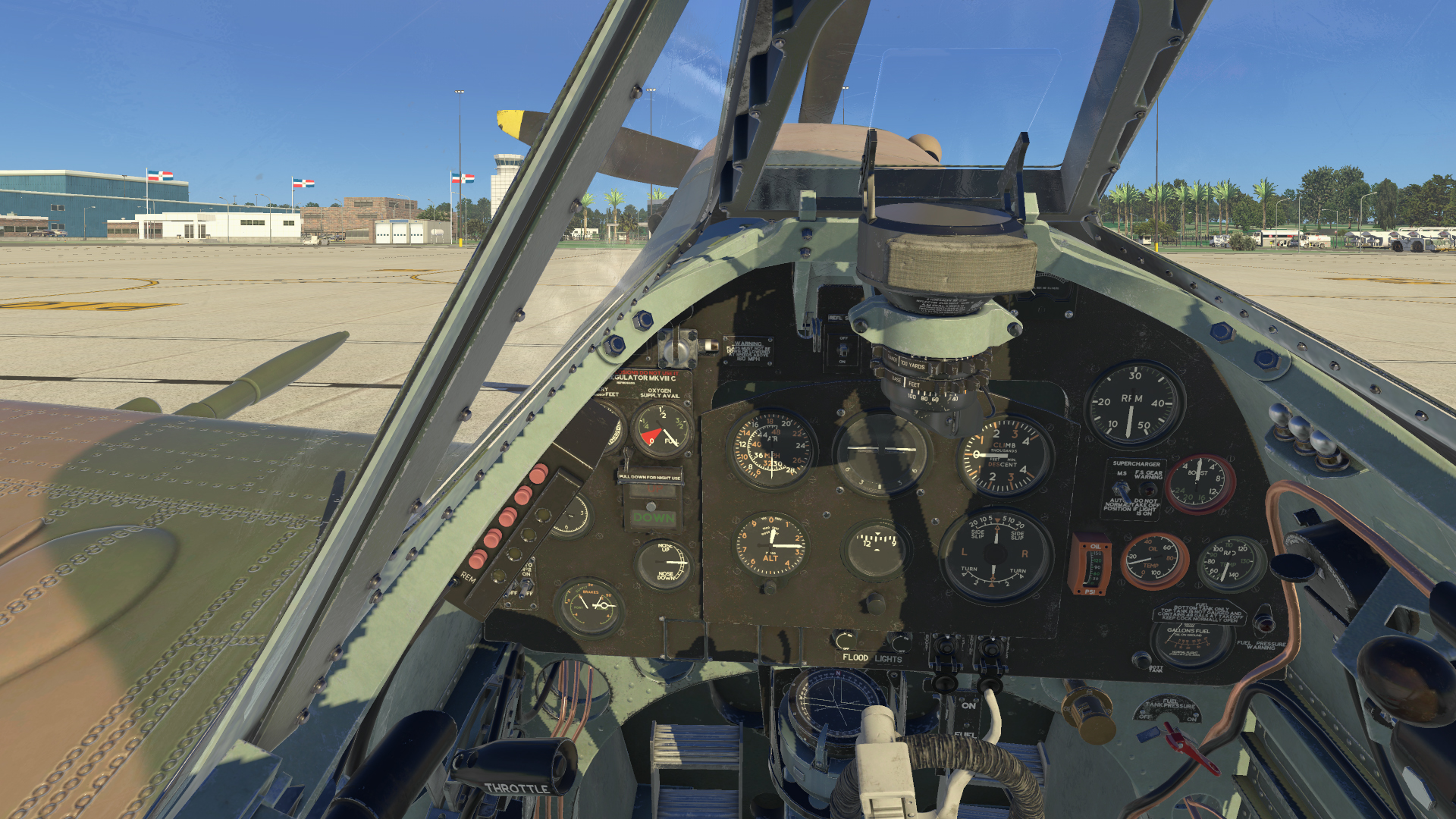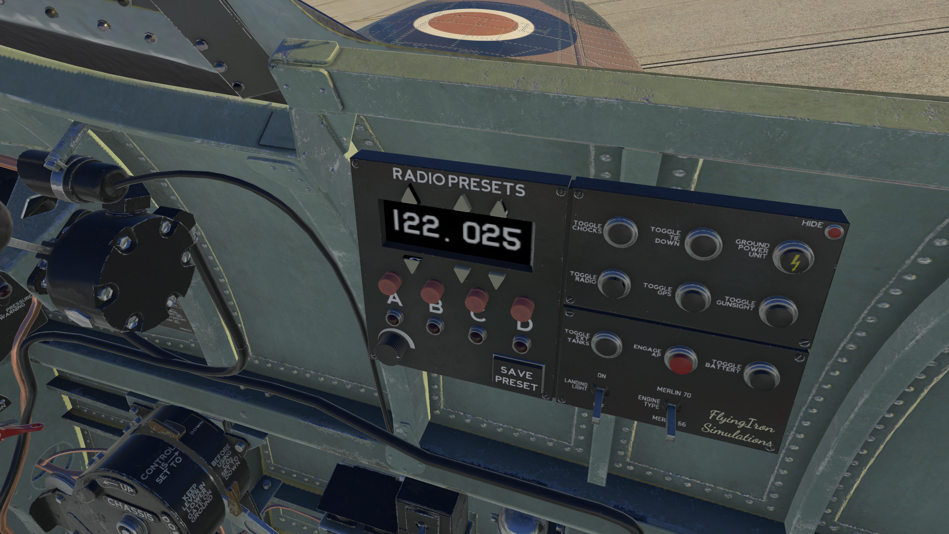 As with all nose-high, tail-wheeled aircraft, it can be hard to see over the cowling, so I like to adjust my eye-point slightly left of the instrument panel to help with taxiing. I also mapped some other views to my preference. There is a hidden click spot above the right-side controls that opens the VR/GUI box. There are several interior controls on this box, first, on the real Spitfire, the battery terminals would be connected by the ground crew but with the simulated version there is a button on the VR/GUI box. The other options available are the ability to tune & save radio presets, adjust radio volume, activate the autopilot (straight & level flight only), landing light control, display the gunsight, and enable the modern avionics (GPS and modern radio).
