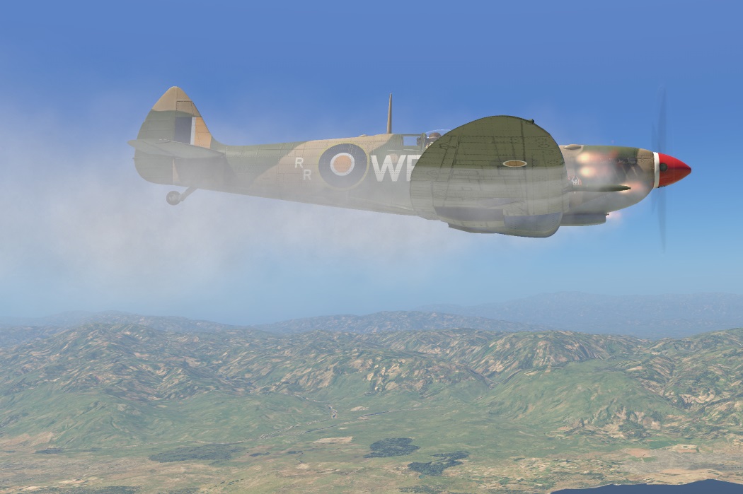 The manual only provides minimal pre-flight procedures including setting the parking brake before engine start. I learned this the hard way (despite holding the brakes, the aircraft wanted to move forward after engine start), until figuring out how to apply the parking brake (reread the manual). Startup procedures are very straight forward, and I was able to start the engine without issue. The only times that I had an issue, even when following the checklist, is that I would forget the magneto switches. Taxiing requires some practice especially if you have not operated a tail-wheeled, nose high aircraft. The realistic way is to perform a series of small s-turns to see ahead of you. That is the easy part though, the hard part is controlling the power, speed and knowing when to brake. Basically, provide short bursts of power (about 1500 RPM), and turn with the rudders. If you must stop, reduce power to idle, let the Spitfire slow down on its own and then brake if necessary. Brake with too much speed and suffer the dreaded ground loop, which I have done a time or several in this and other tail-wheeled aircraft.