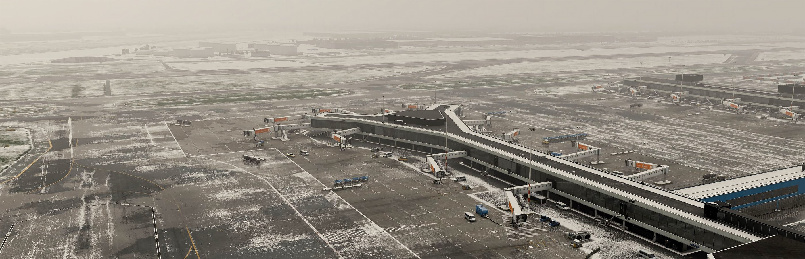 The scenery features an accurate rendition of the airport, with PBR materials, high-resolution ground textures with custom weather maps, detailed surrounding scenery with numerous custom buildings, tridimensional terrain including tunnels and bridges, surrounding photoscenery, animated apron and local road traffic, dynamic lighting, animated jetways, and VDGS (requires SAM).