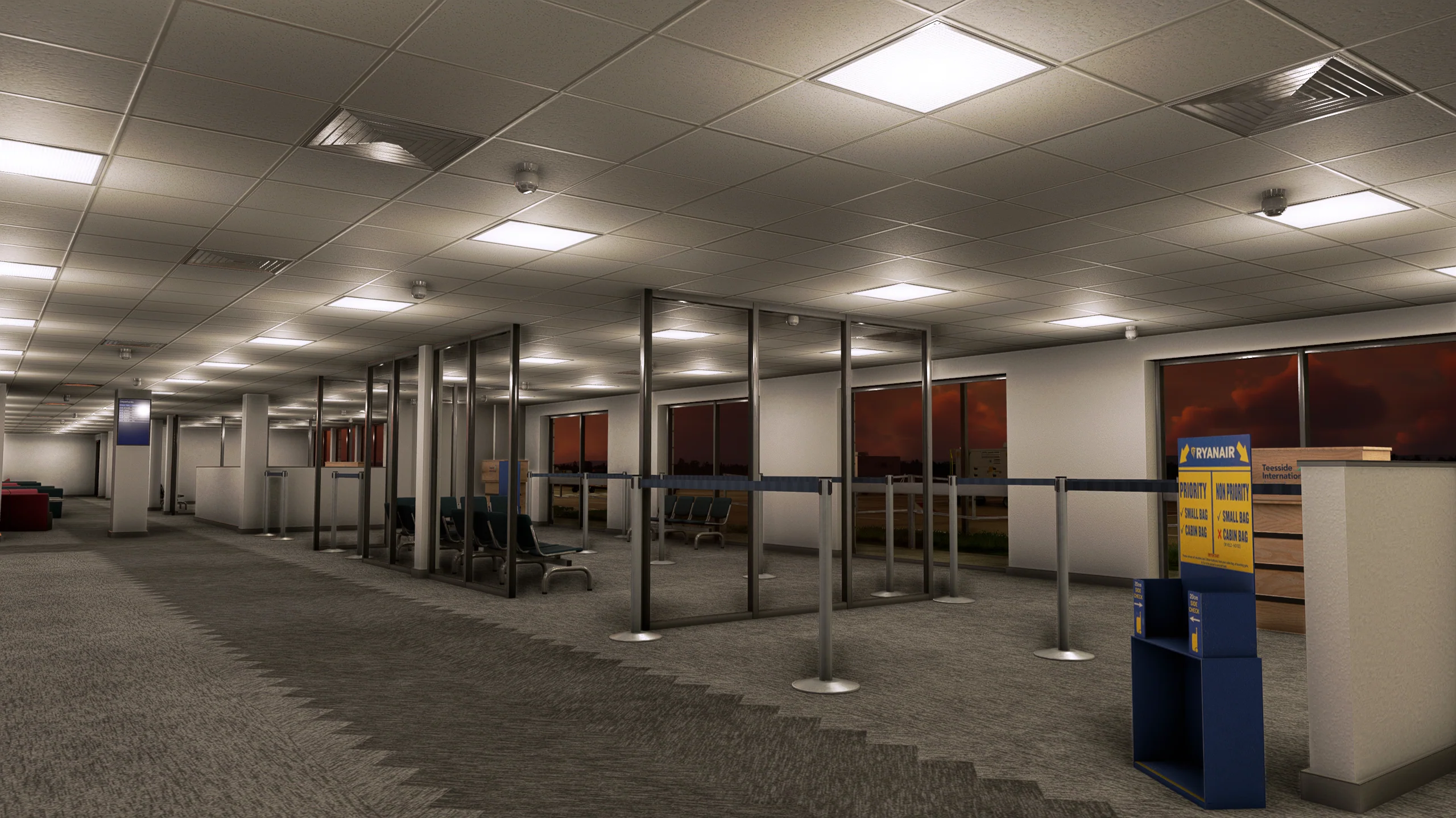 The scenery features an accurate rendition of the airport, with PBR texturing, custom orthophoto for the airport and surroundings, custom terminal interior, custom ground textures, high-resolution textures, and more.