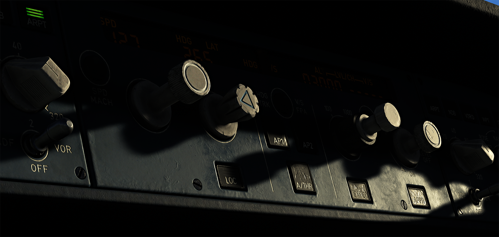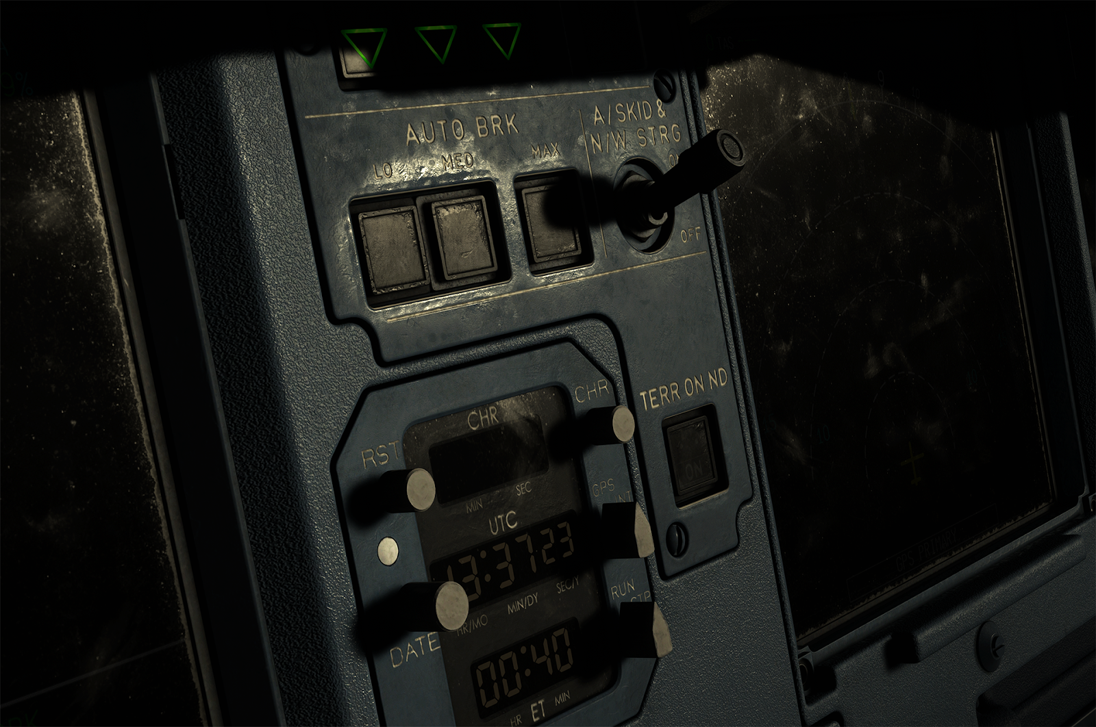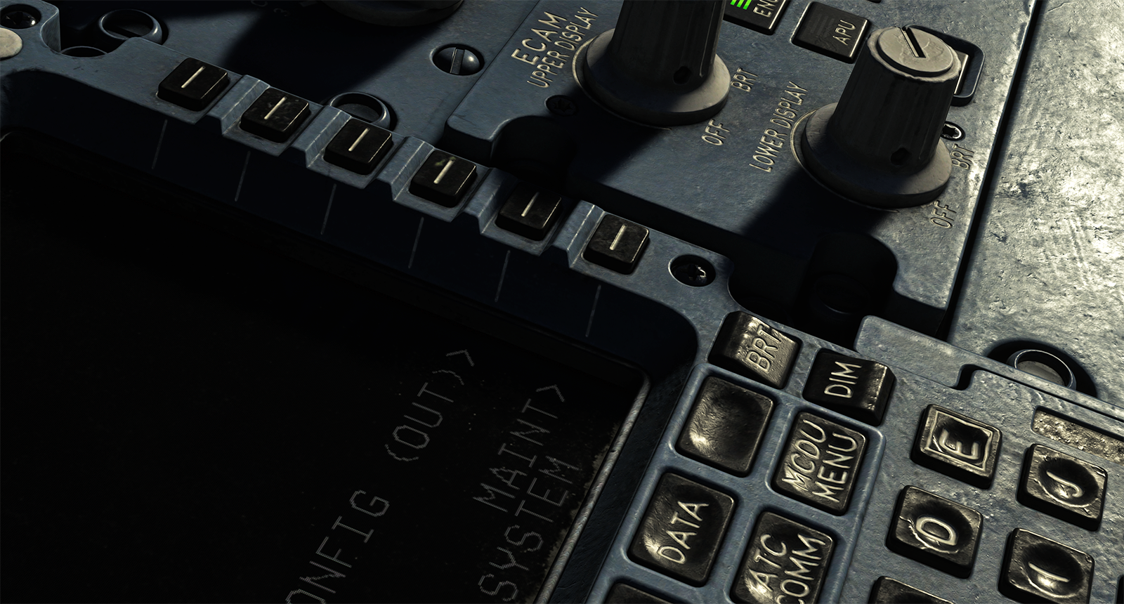 These images display a level of texture work and detail that was once inconceivable. The texturing shown above, perfectly resembles that of the typical A320 cockpit surface, hard worked, worn and cold to the touch. Notice the swelling edges on the panels, the oily touch points, the dents and scratches, all randomly occurring. It is evident the team have been meticulous and extremely detail driven whilst composing this aircraft.