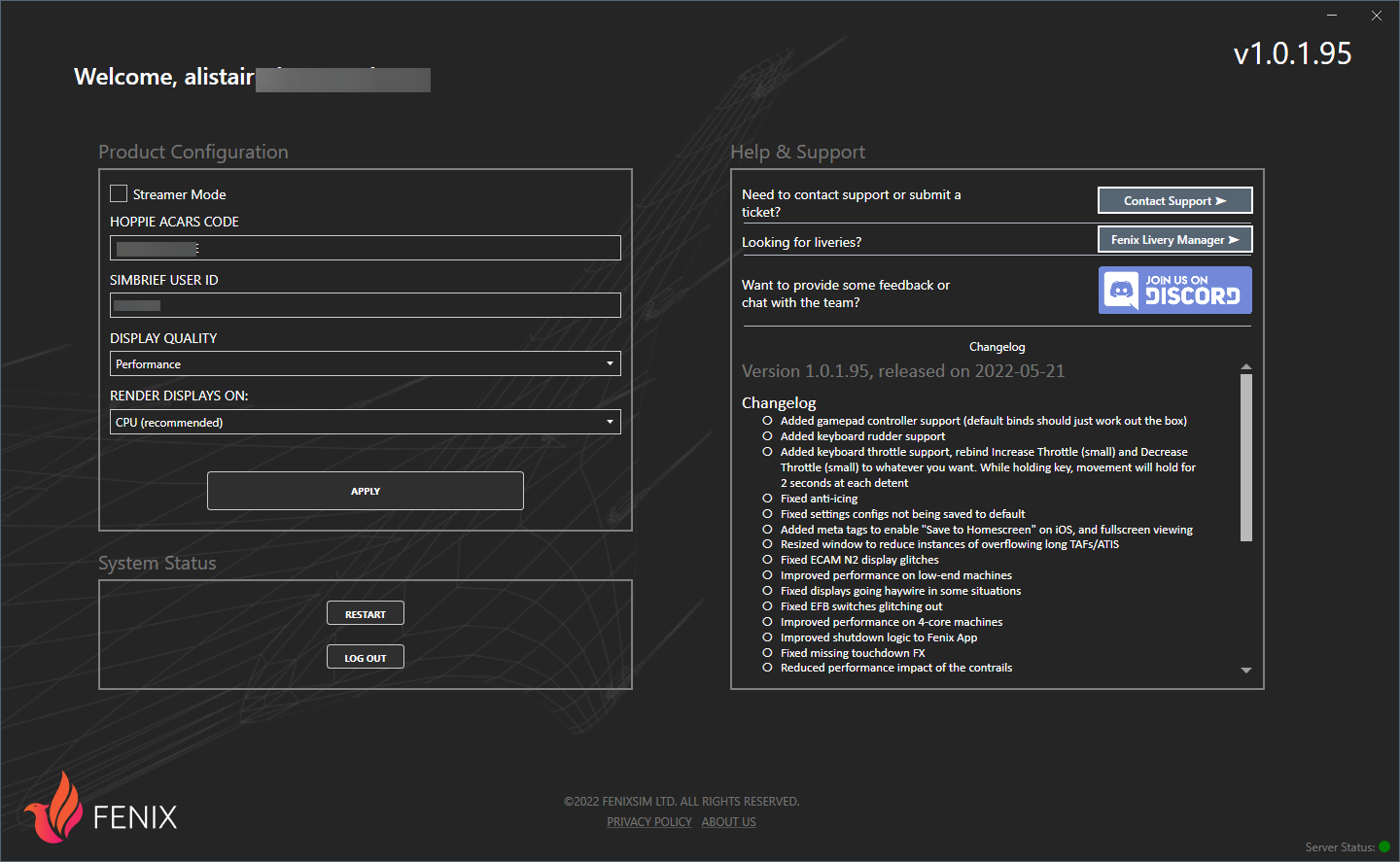 Once purchased, you are taken to an order page where you can download the 1.4GB exe file. Then you can run the file, and it will install everything needed for you. Two apps will be installed: the Fenix Simulations app and a livery manager. To complete the installation, you should open the Fenix App and enter your SimBrief ID and Hoppie login code. The app can also be used to change the rendering options for the screen and the hardware they run off; though more about that later. Overall it was a very simple installation, and I had no issue installing the aircraft.