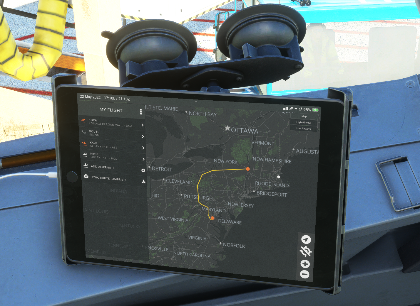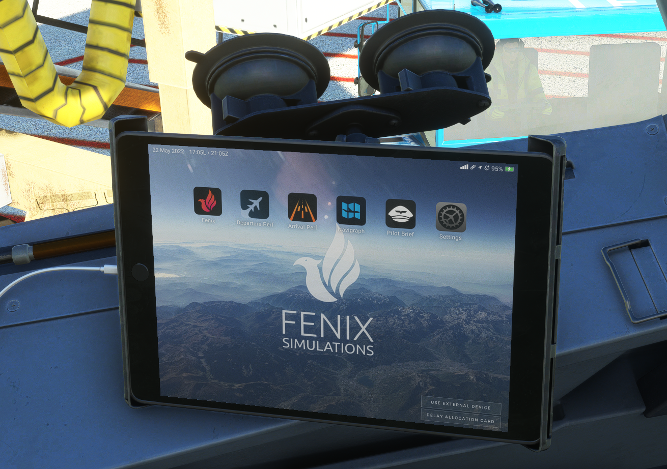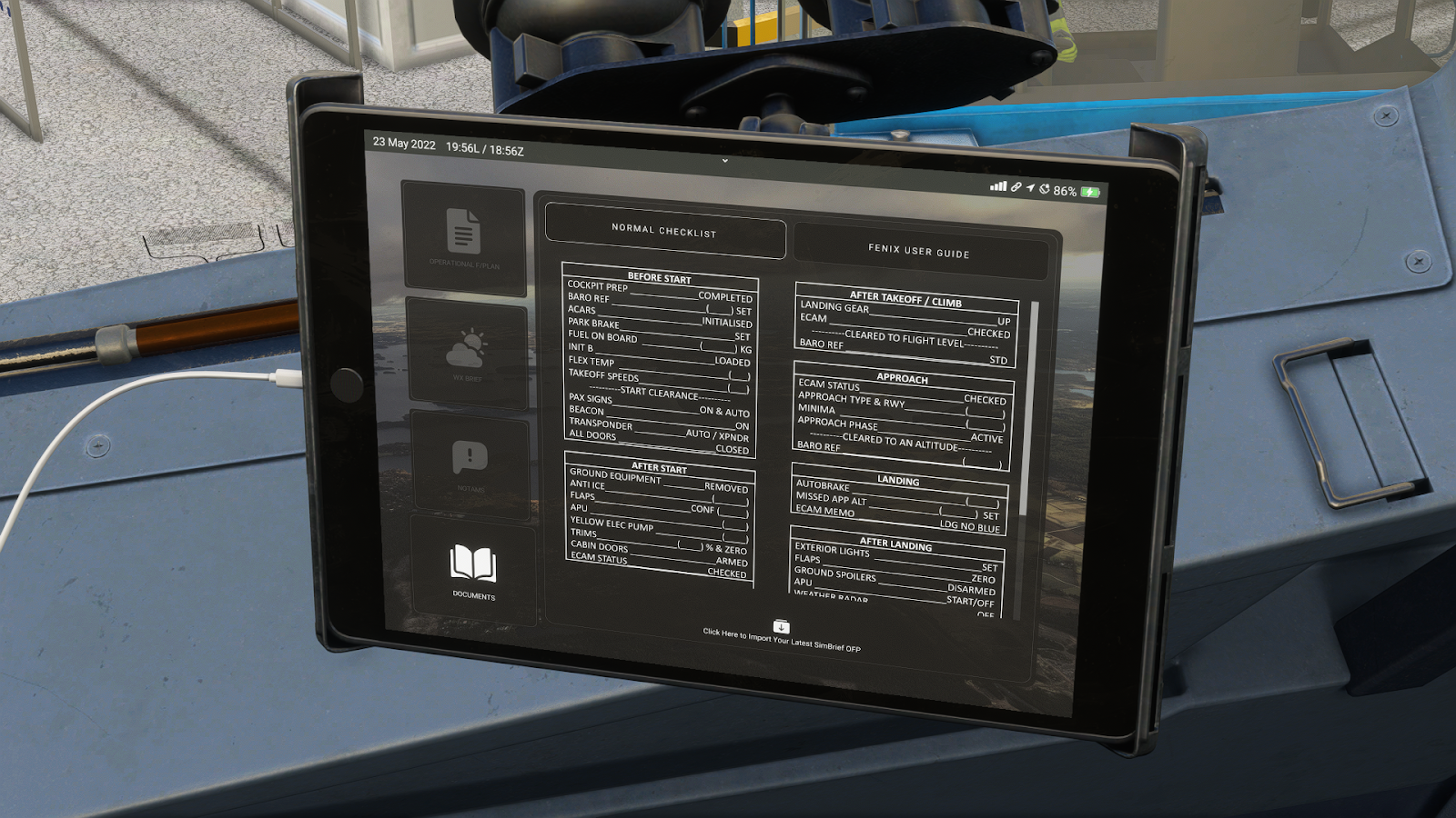 Fenix’s EFB (Electronic Flight Bag) is one of the best flight sim industries. Representative of Apple’s “iPad,” the EFB comes with many useful features to assist you with your flying experience. Fenix has done a great job at simulating a tablet, between having to “sign-in” and a fully operable battery that loses power when the tablet isn’t plugged in. It also contains external device functionality for pilots who desire to mirror the tablet onto their device in real life.