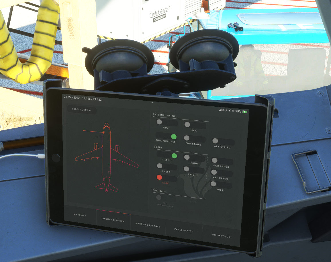 Following the “my flight” page in the Fenix app is the “ground services” tab. Honestly, there’s nothing particularly intuitive with this page. It provides door and basic external services configuration. The Airbus display is a nice touch to inform you of the currently active services. Not-so-prominently located, is the “toggle jetway” button in the top left of the page. Ground services also provide a pushback tool that utilises the default system and is manually controllable.