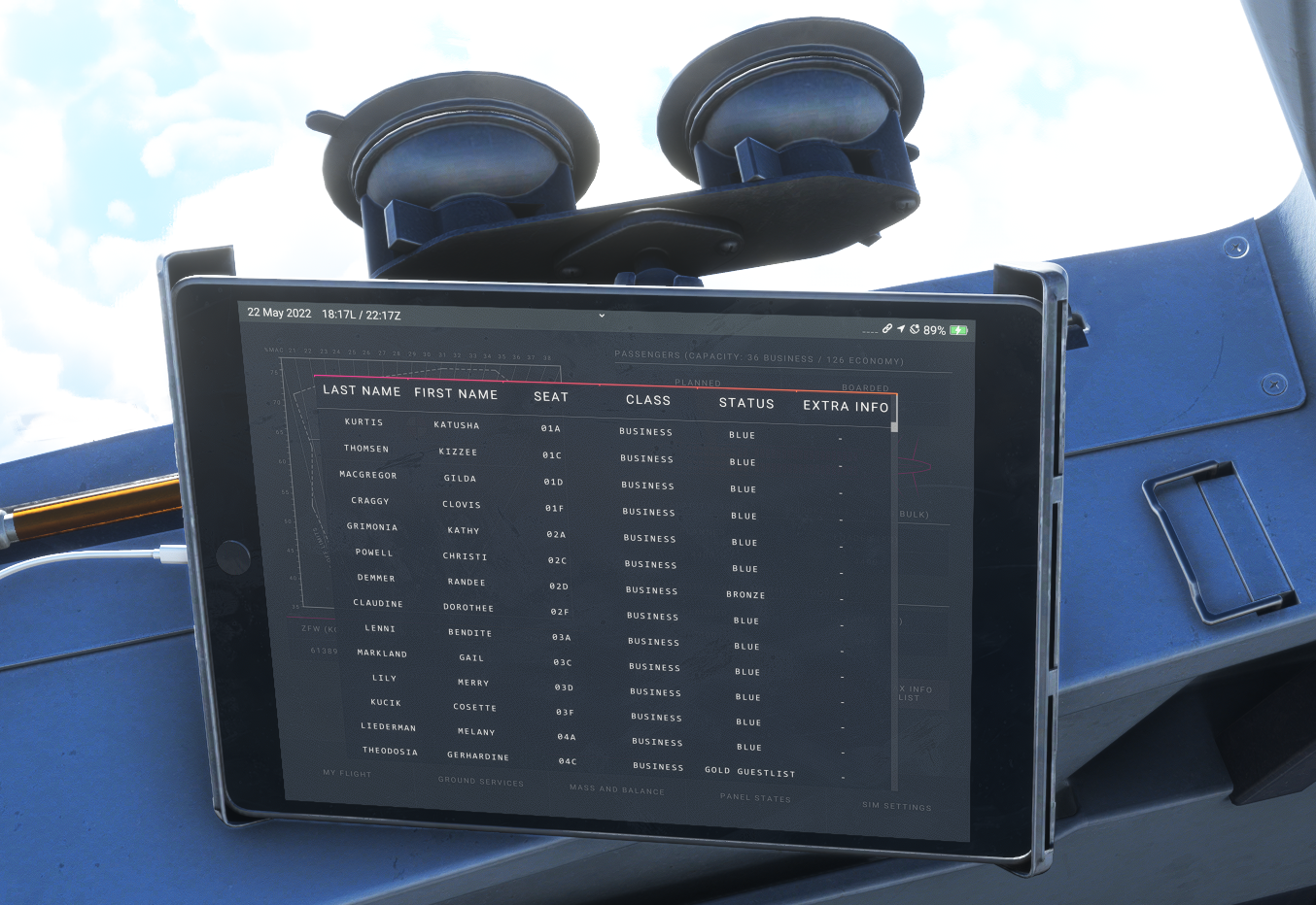 Next on the list is the “mass and balance” page. It allows the user to configure their weight and balance while visualising the weight on a chart. Pilots can manipulate the passenger, cargo, and fuel loads to their desire. After the weights are loaded through the purple button below the fuel box, relevant ZFW, GW, and centre of gravities will populate. A little yet cool feature of this tab is that the pilot can sort through the list of passengers on board. It’s super important as you’ll be able to learn who you need to treat extra special onboard, haha.