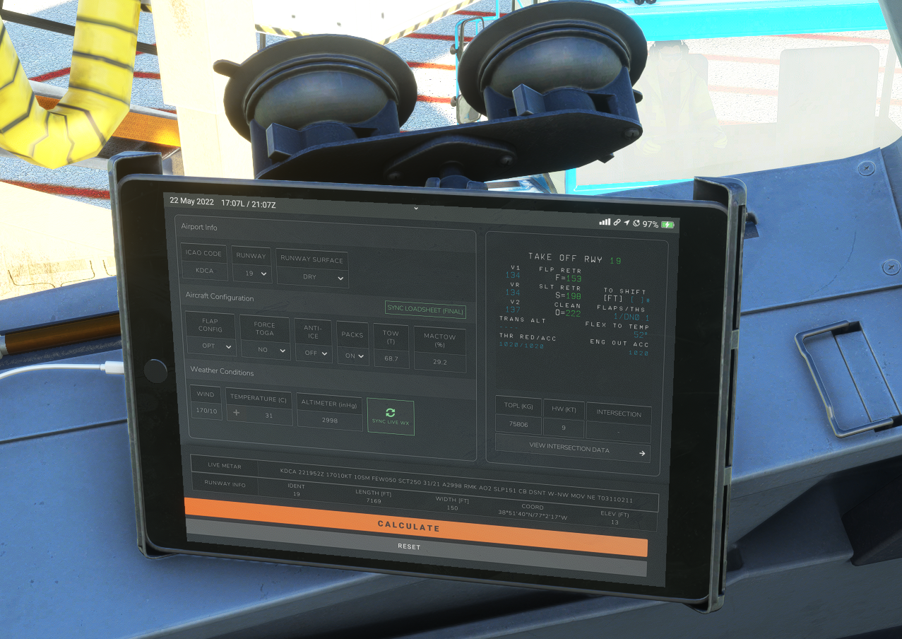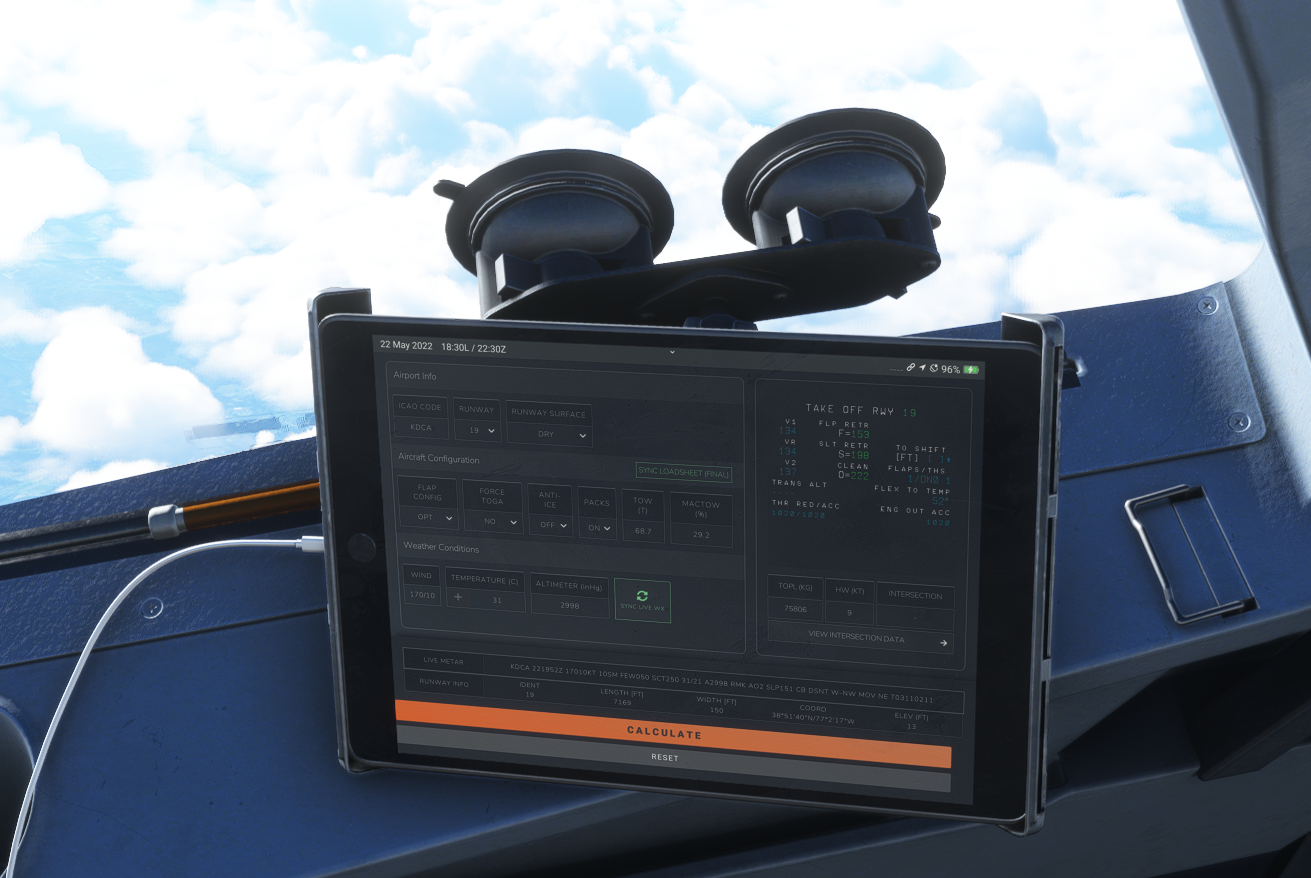 Fenix has provided pilots with a handy tool, the Departure Performance app. Users can select different settings under “Aircraft Configuration” to tailor to the flying environment. Luckily, the app features “syncing” options to input the real-time weights and weather conditions into the calculator. Intersection data is available, too, for pilots who don’t want to utilise the entire length of the runway they’re allocated. Input the intersection you desire into the box on the right-hand side of the tablet, if necessary. After you input all relevant variables, you can calculate your takeoff performance which can be transferred to the FMS.