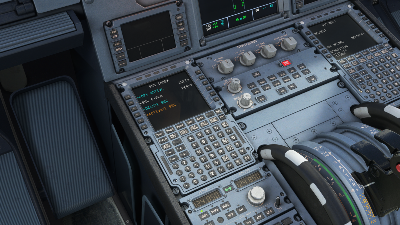 The ATSU side of the MCDU is a whole other ball game as holds some of the coolest features the aircraft has. Once clicked you are welcomed with a choice between ATC Menu, AOC Menu, COMM Menu and the datalink STATUS. The ATC menu allows you to request directions, altitude changes or speed due to weather or the aircraft’s performance. This utilises the HOPPIE network to talk to controllers and allow you to make these requests.