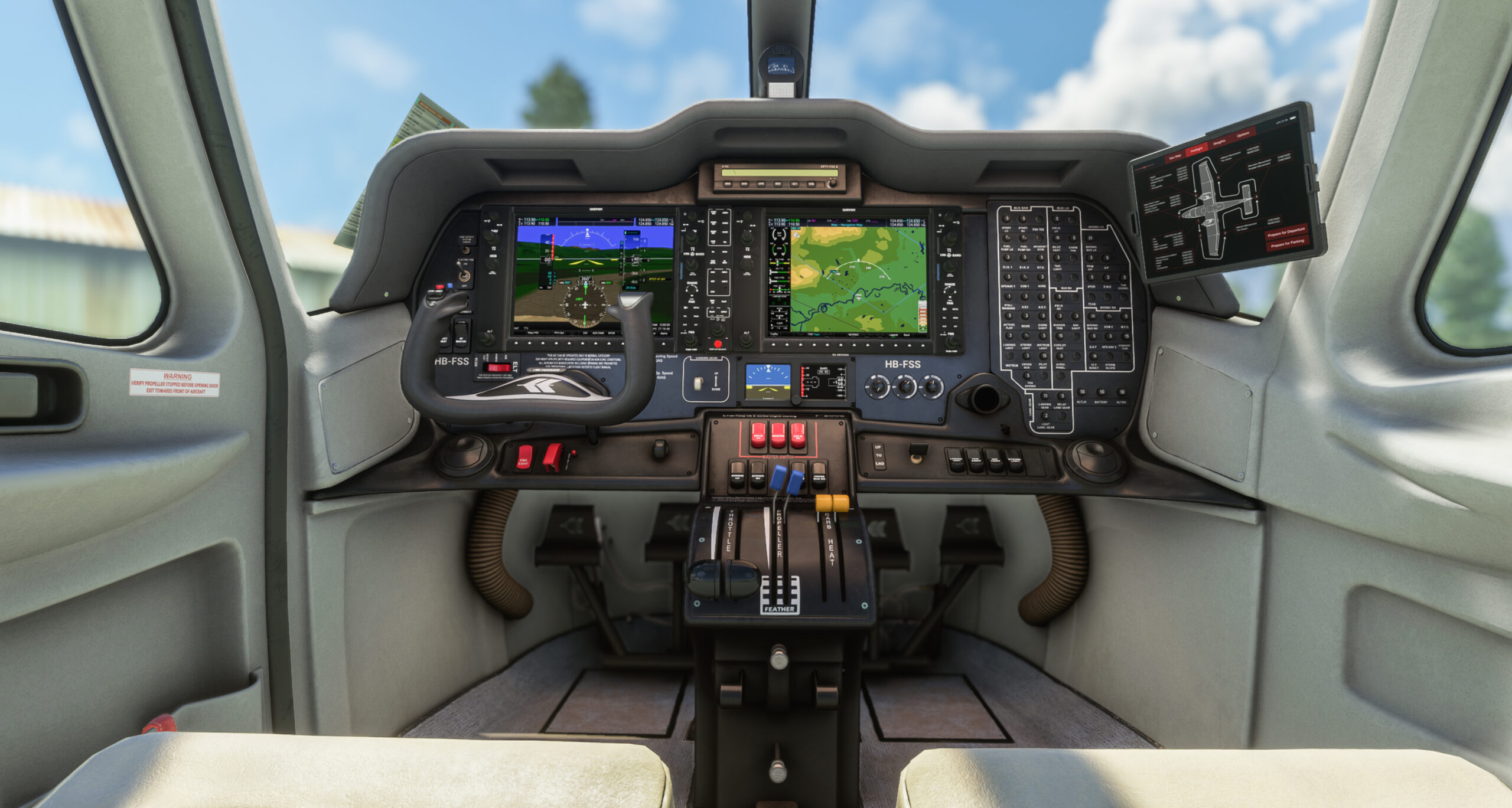 The model uses a customized version of the G1000 NXI by Working Title, with custom CAS messages, custom engine pages, the GMC225 autopilot system, and a working FMS keyboard. FADEC systems are also modeled for the two Lycoming engines. Ease of use features include an EFB tablet with aircraft config options, moving maps, panel state loading, FSS Mission hub, and more. Custom sounds cover the entire aircraft as well.