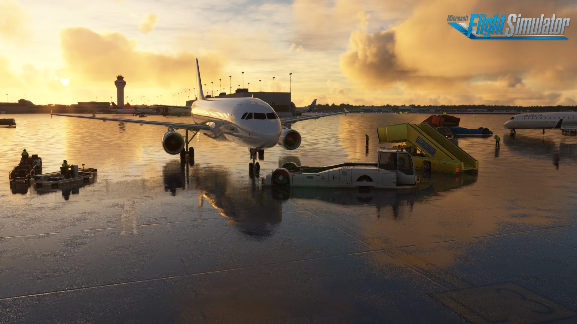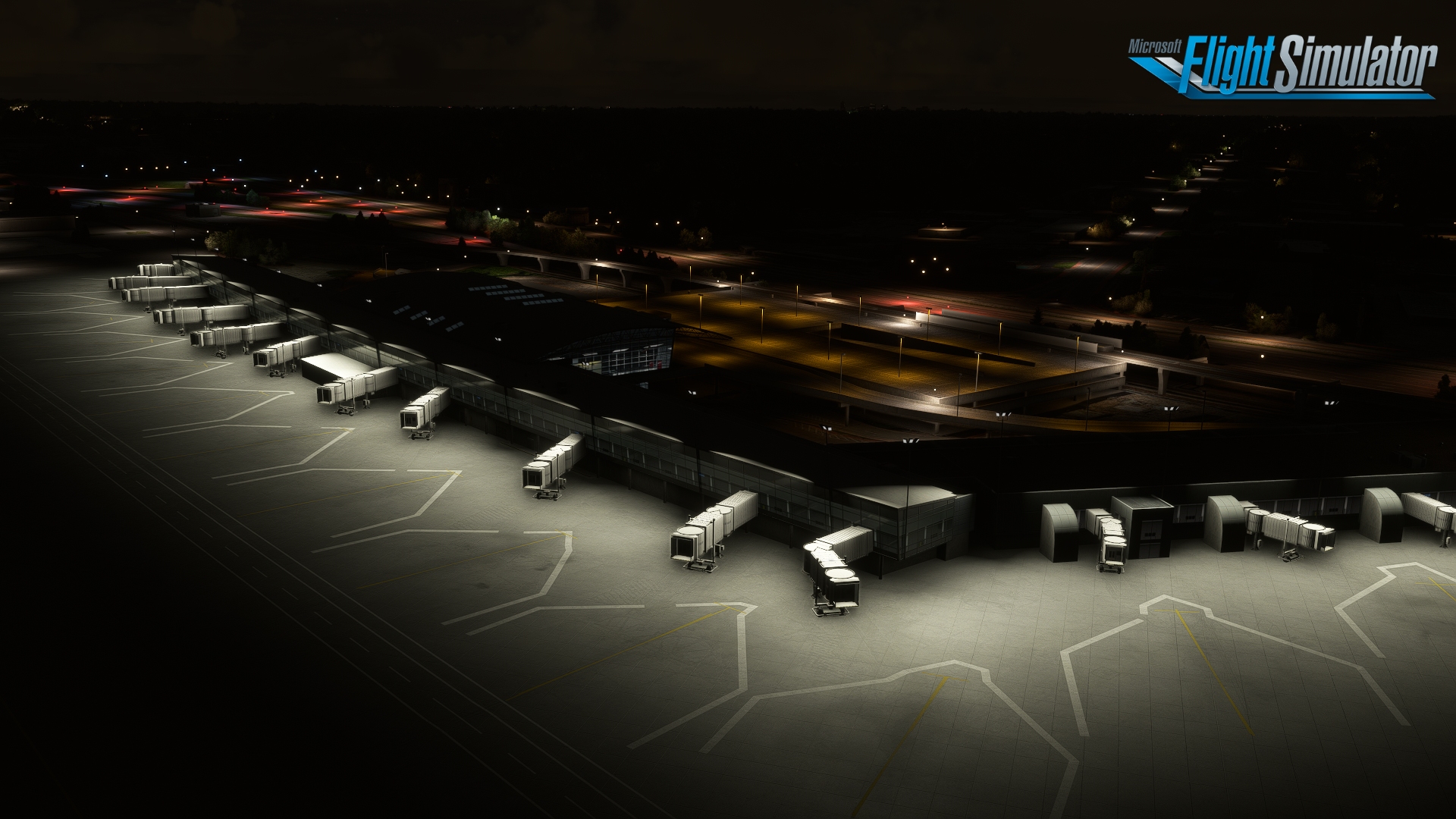 The scenery features an accurate rendition of the airport, with over 60 custom buildings, custom animated jetways, custom night lighting, custom ground clutter, realistic terrain elevation, and high-resolution ground textures.