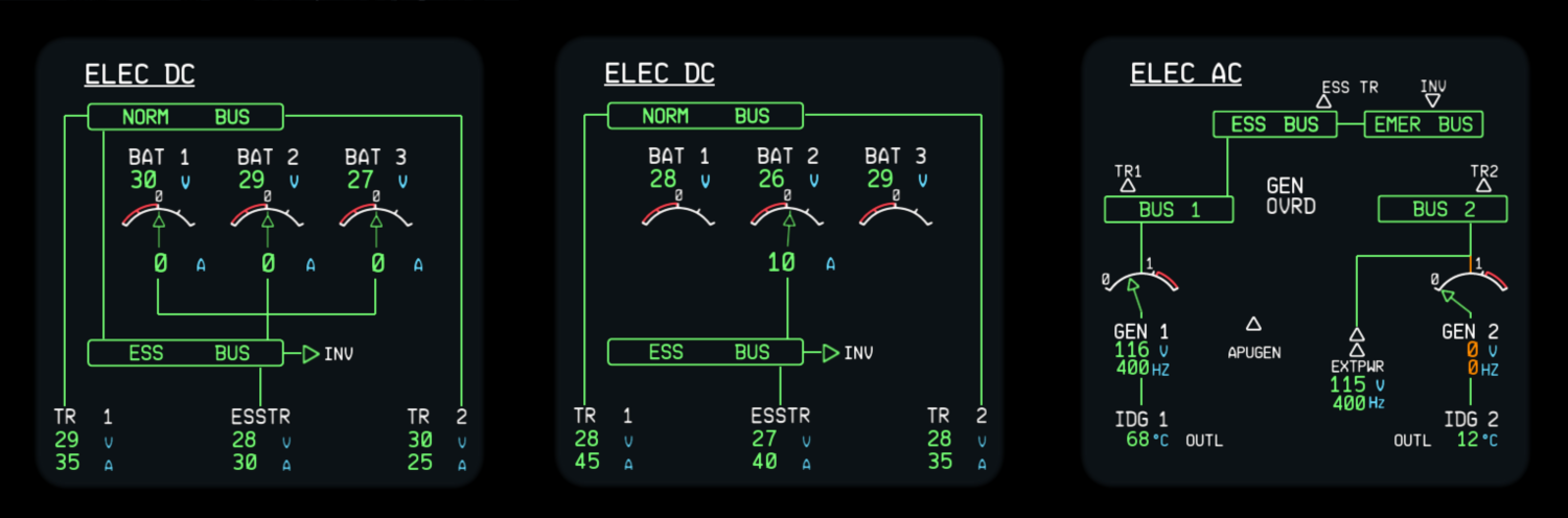 “The last system page preview we have is the ELEC AC page. Things to point out here are the fact we’ve modelled IDG oil temperature, based on quite a few factors. For example, if we look at ‘IDG 2’; where the engine is off; this temperature then depends on the outside air temperature at the time plus a thermal oil retention factor. If we compare this to IDG1, where the engine is running, we can see this is dependent on the ELEC system load. To add, please note all voltages and HZs present, all vary in real time along with GEN loading.”