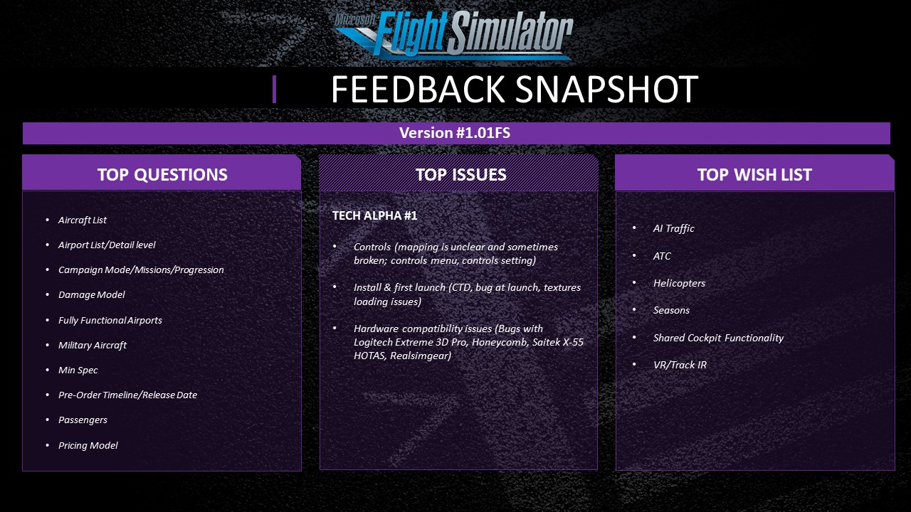 Lastly, the team attached a feedback snapshot from users of Tech Alpha 1 (this has previously been published). The main questions revolved around the aircraft list and the level of detail those default aircraft will contain, as well as questions about missions and a damage model.