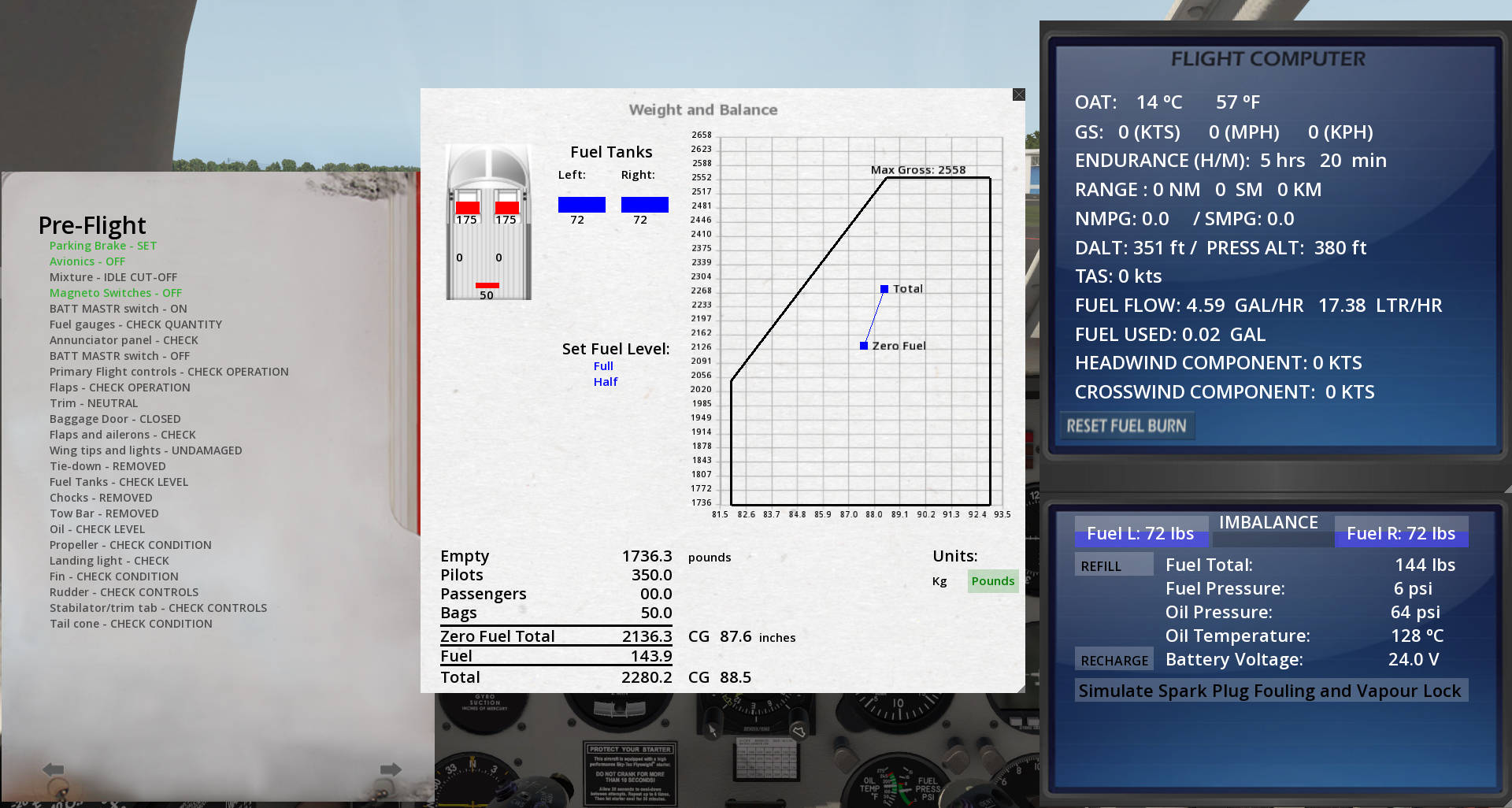 - Dedicated interactive engine pop-up window displaying values such as fuel tank weights and imbalance, fuel pressure, oil pressure, oil temperature, battery charge (with quick charge option), and information about spark plug fouling and vapour lock condition