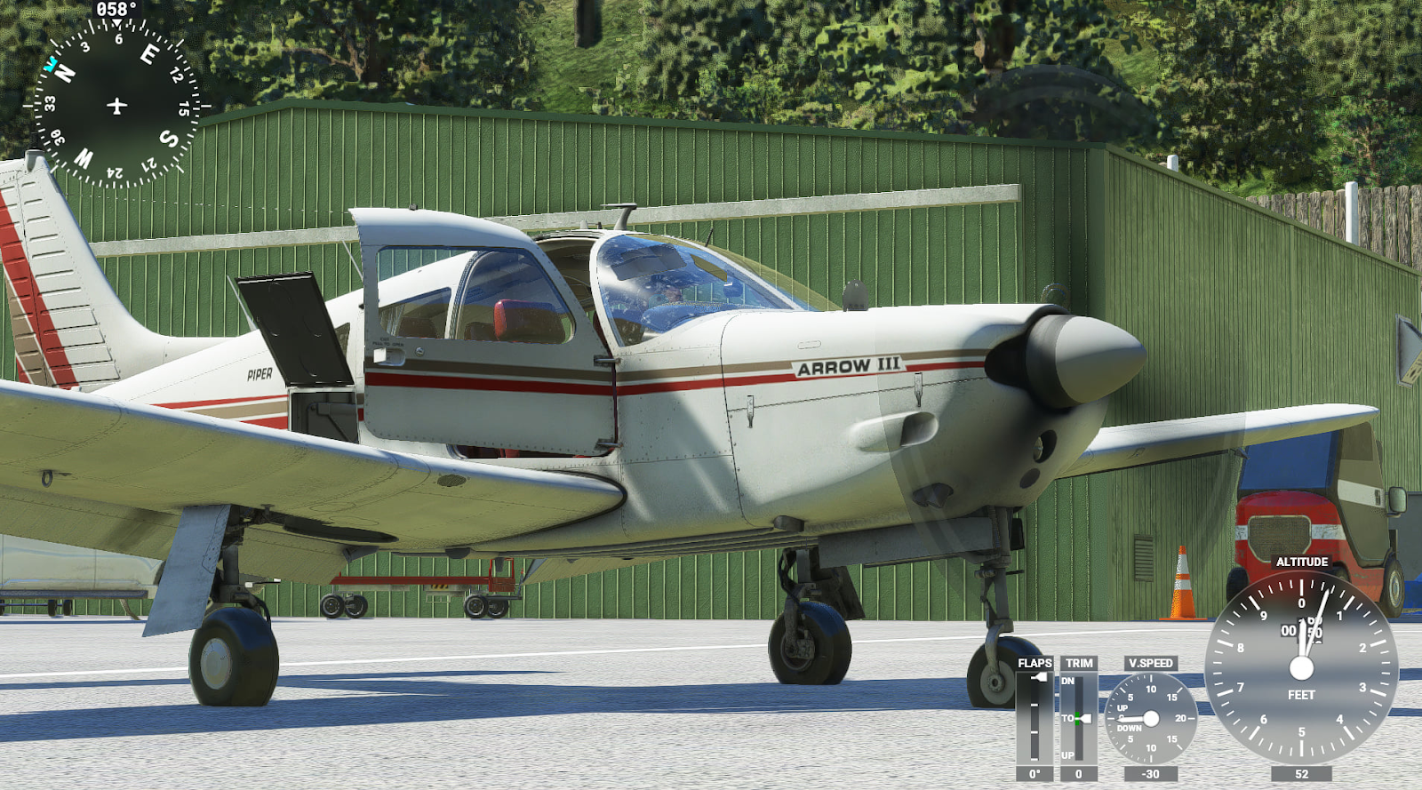The aircraft in development by JustFlight is the Piper PA28 Arrow III, a four-seater aircraft developed by Piper meant for flight training, air taxi, or personal use. The aircraft features retractable gear and is powered by a Lycoming IO-360-C1C6 capable of 200 horsepower. The plane has a top speed of 149 knots with a range of 695 nautical miles, making it a perfect general aviation aircraft for cross country excursions at comfortable speeds.