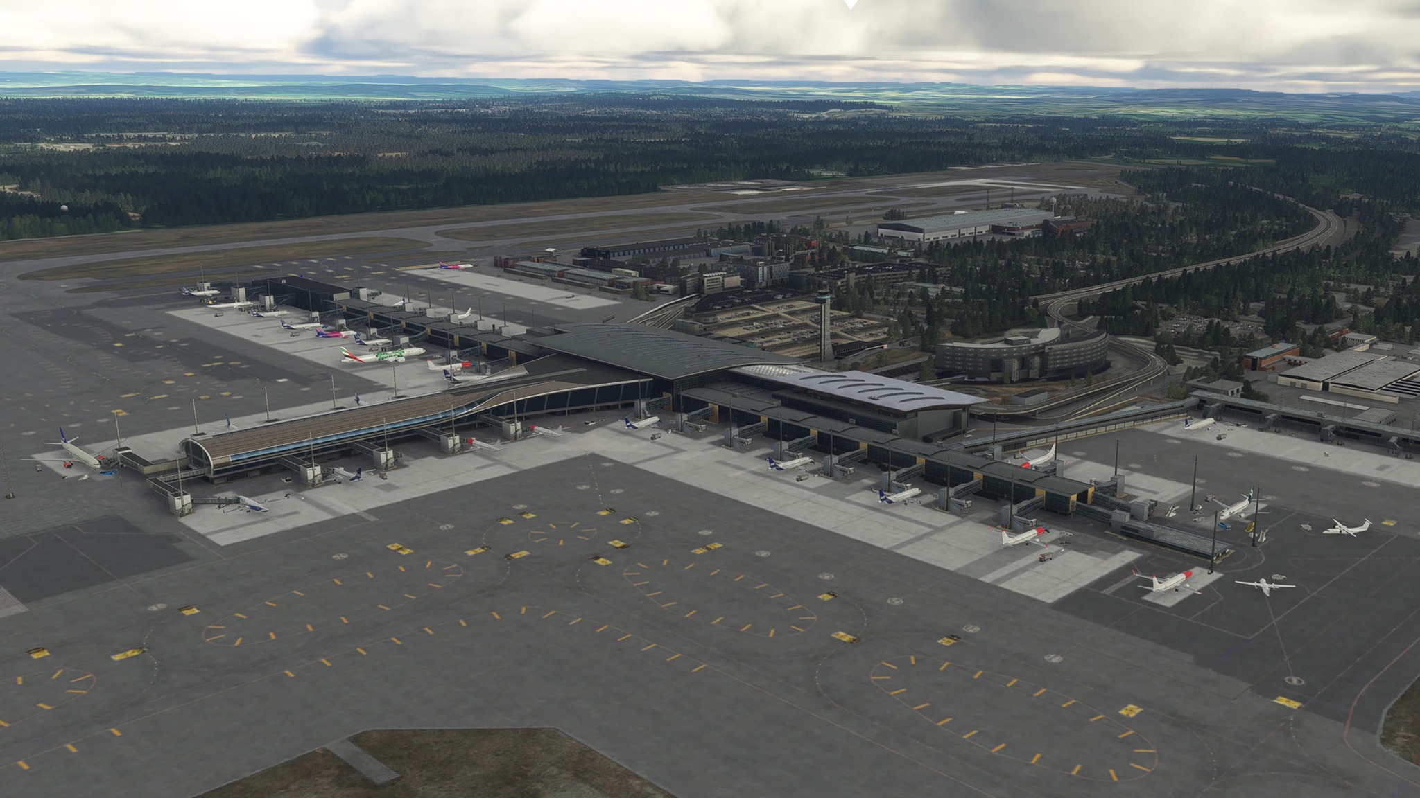 The scenery features an accurate representation of Gardermoen as it currently stands, with an updated ground layout, custom jetways, a deicing area, and landside objects.
