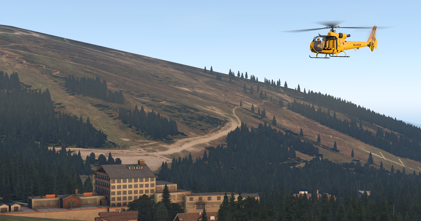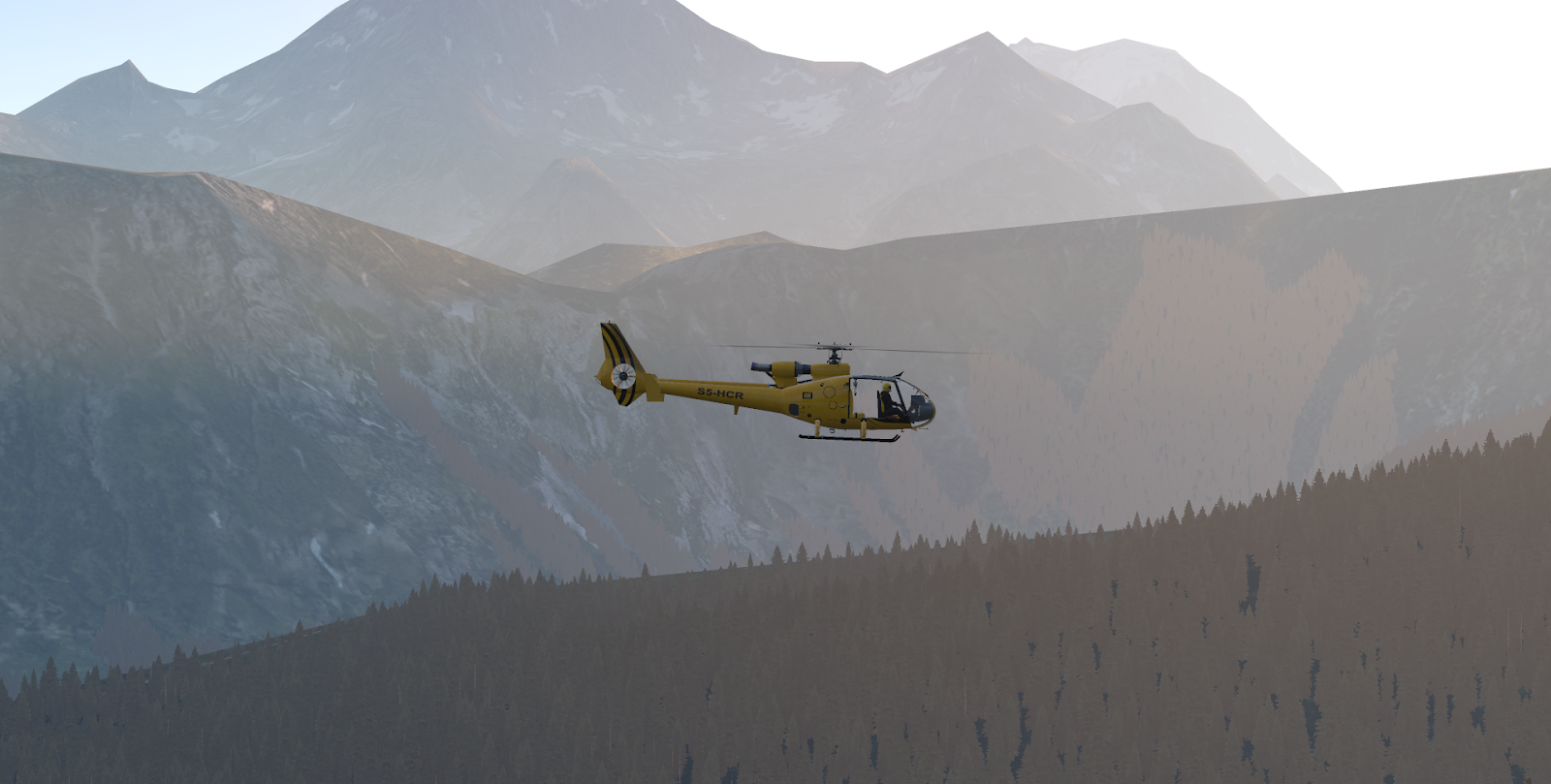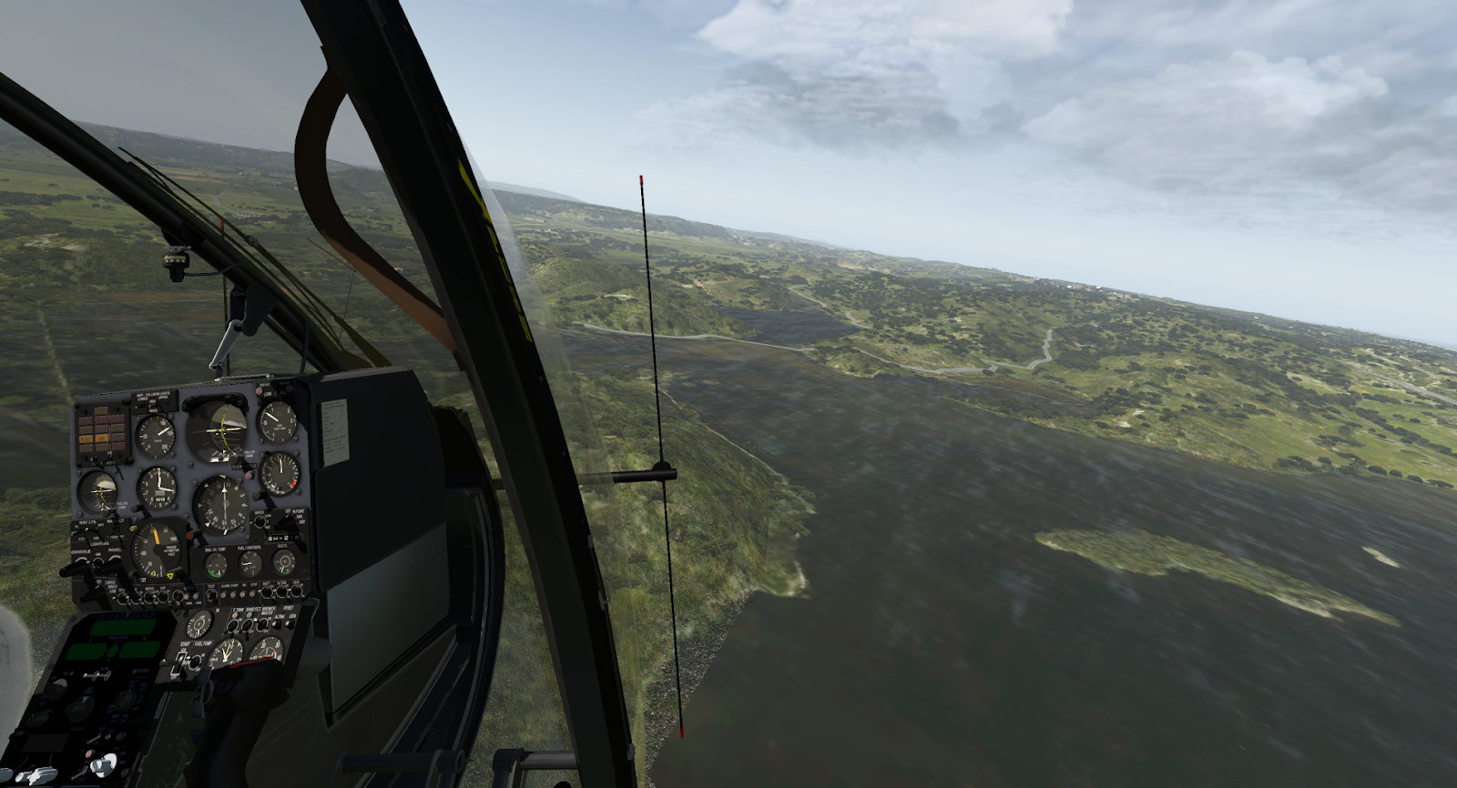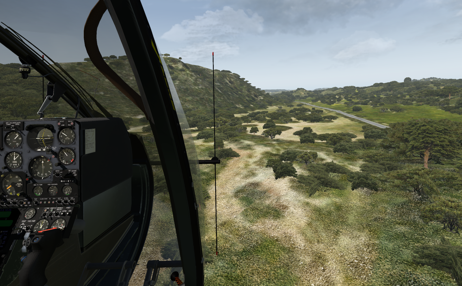 The textures, universally, are too smooth; on the exterior they are too shiny and on the interior console too flat. JRX have provided a bunch of great liveries for both the civilian and military variants, and I wish the material depth could do justice to their resolution and detail. At close zoom, the Gazelle can look out of place with the rest of the X-Plane world – shining brightly as if emitting light itself. I like to fly this module with a narrow field-of-view to help with depth perception as I zip between trees, which means I am inevitably zoomed in close to some portion of the main console; the console gauges are crisp and readable from any distance, but the space in between instruments is lifeless and sometimes distractingly bland as the rest of the world zips by in a scatter of color. A bit of roughness, a scratch here and there, any detail to suggest this aircraft is something other than a precise CAD model export, would evaporate these criticisms, especially since the underlying geometry itself is of such high quality.