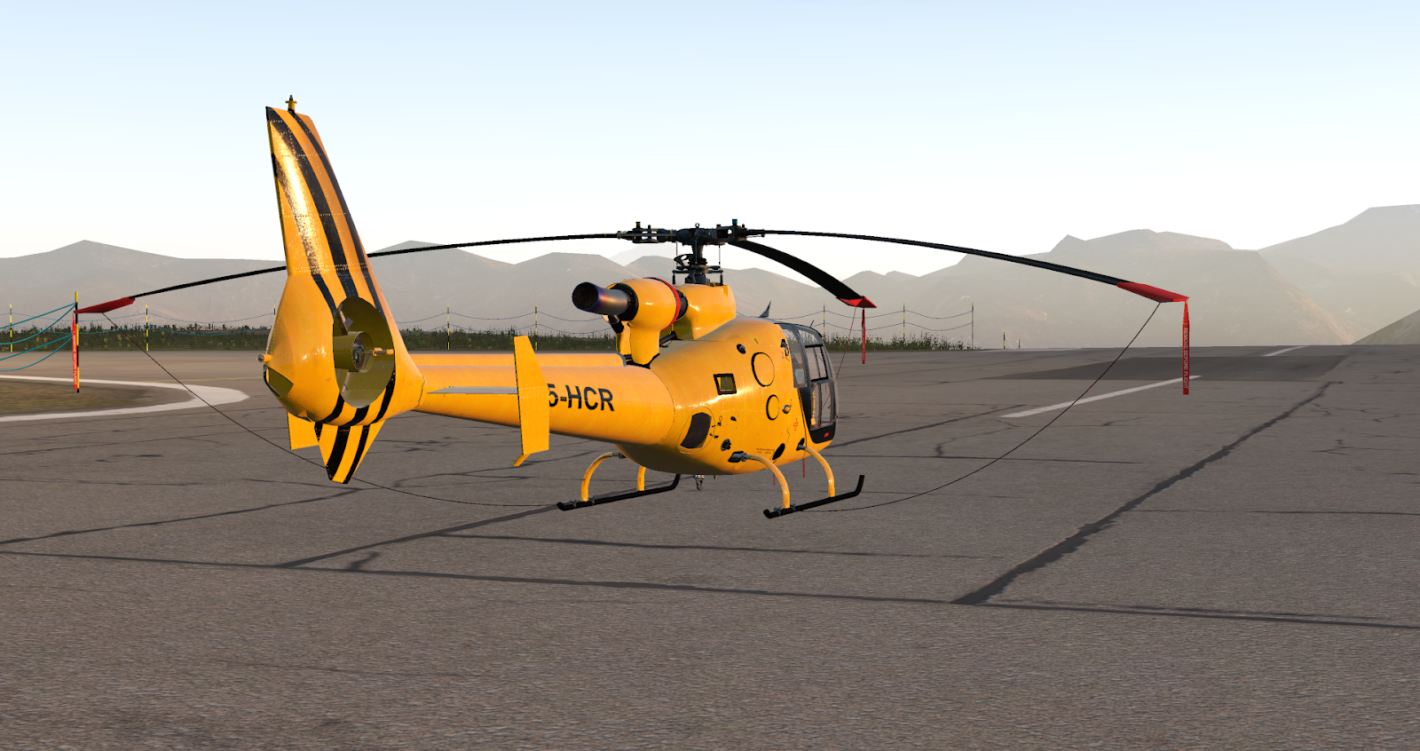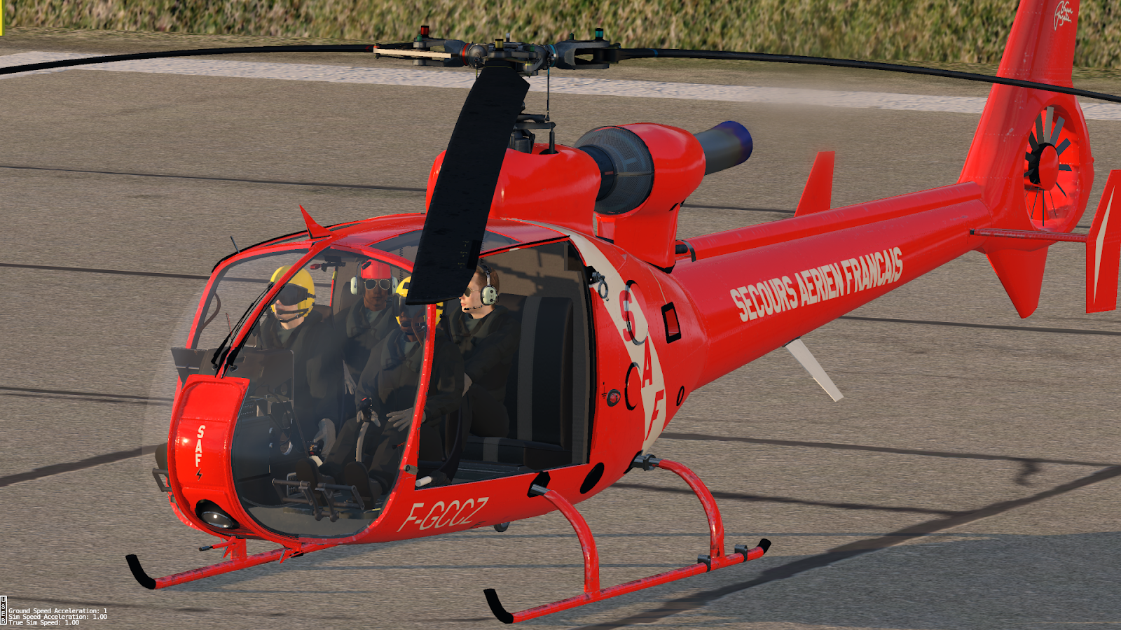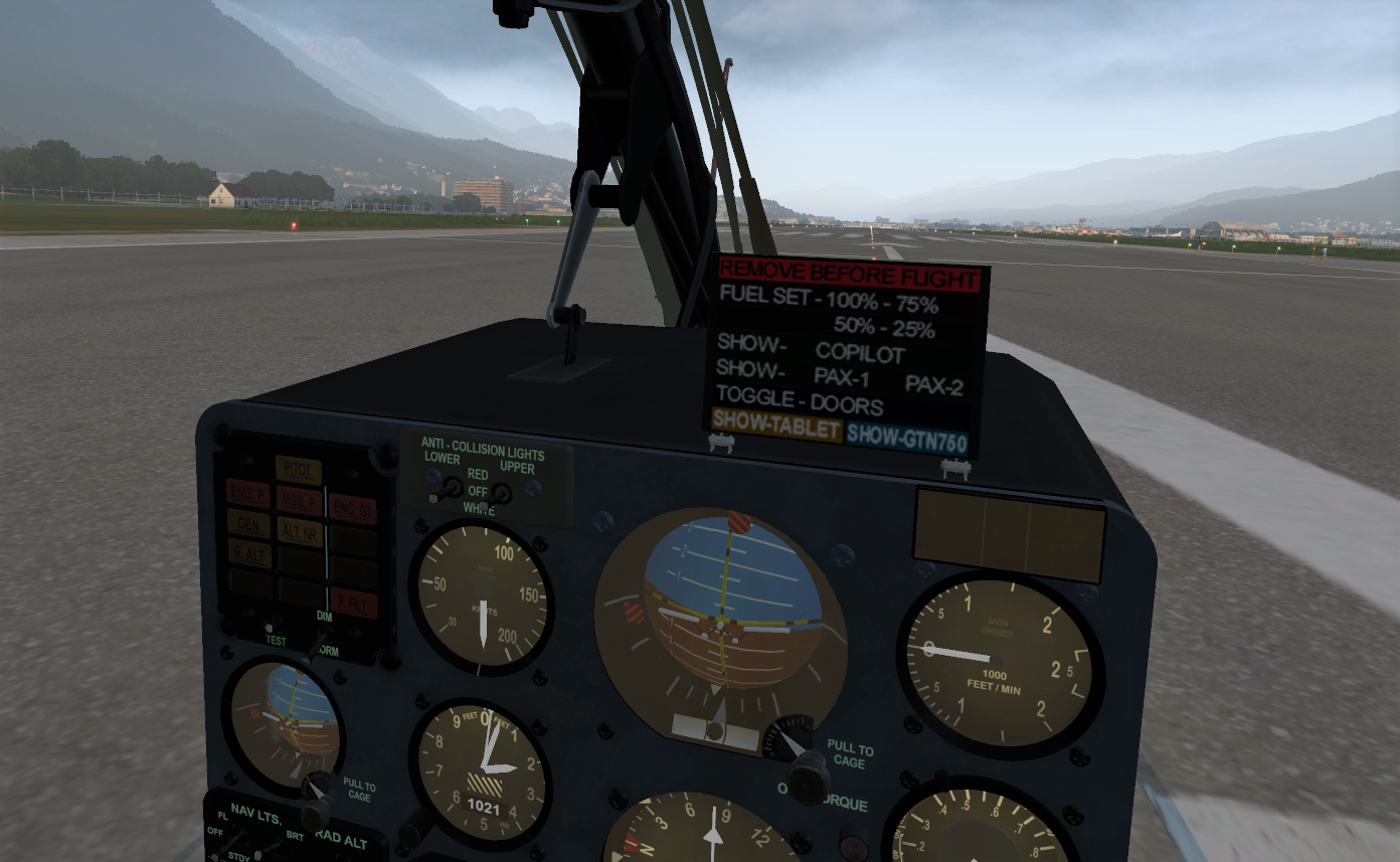 JRX have not provided the ability to spawn the Gazelle with engines running, a damnable sin for any payware I think, but thankfully the Gazelle is an easy start by hand. If you prefer cold and dark aircraft JRX have included rotor blade tie-downs toggleable via a flip-up panel on the main instrument console. Also included on this panel are copilot and passenger toggles, fuel fill levels, tablets, and doors – take your doors off; this is a proper scout helicopter, after all, and the view is magnificent.