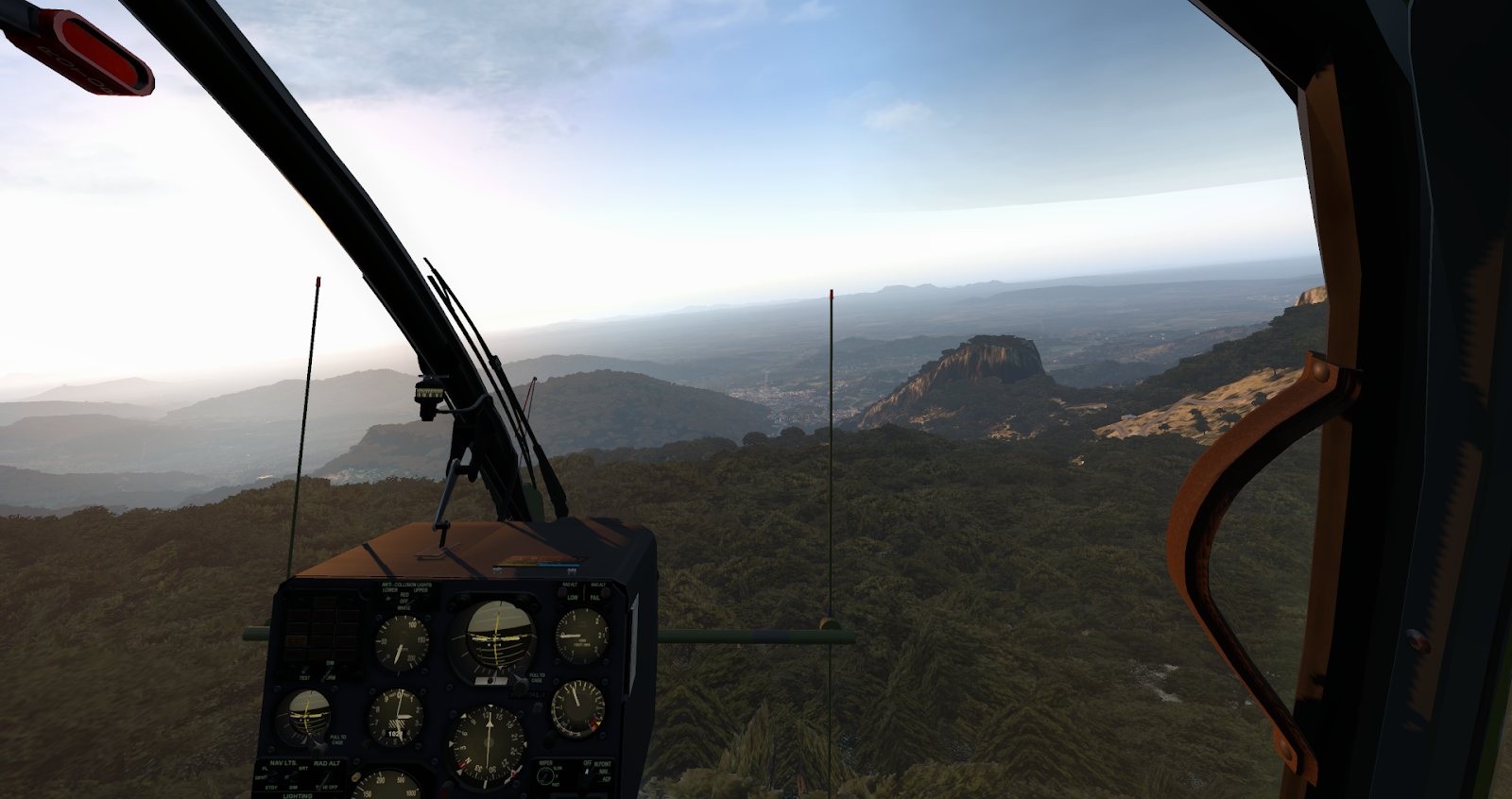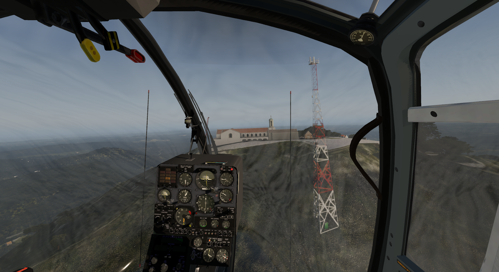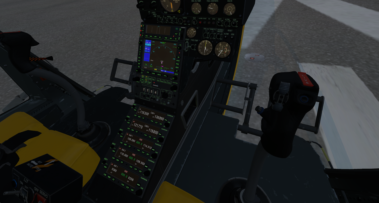 A notepad with checklists and reference sheets is clickable next to the center instrument console. I vastly prefer diegetic interfaces like this options panel and notepad to proprietary pop-up menus; they allow a pilot to maintain her immersion in the simulated world and help the aircraft feel alive and physical. Starting the Gazelle requires a few switches, a wait for turbine wind-up, and opening of the fuel flow lever; a studied pilot can raise her skids in 30 seconds. It will take more than 30 seconds to set up your radios if you plan on either communicating or navigating with them; this is standard with almost any aircraft, though Gazelle startup is otherwise so simple it somehow feels notable. Other than turbine ignition, there are switches for windshield wipers, lights, and basic avionics calibration, but the Gazelle is mostly autonomous in its management; you will need all your attention to fly it, anyways.
