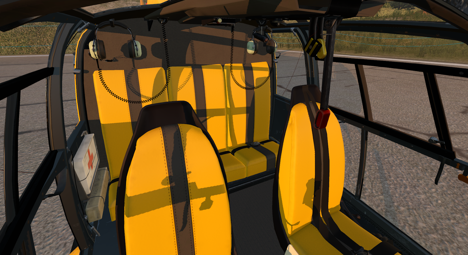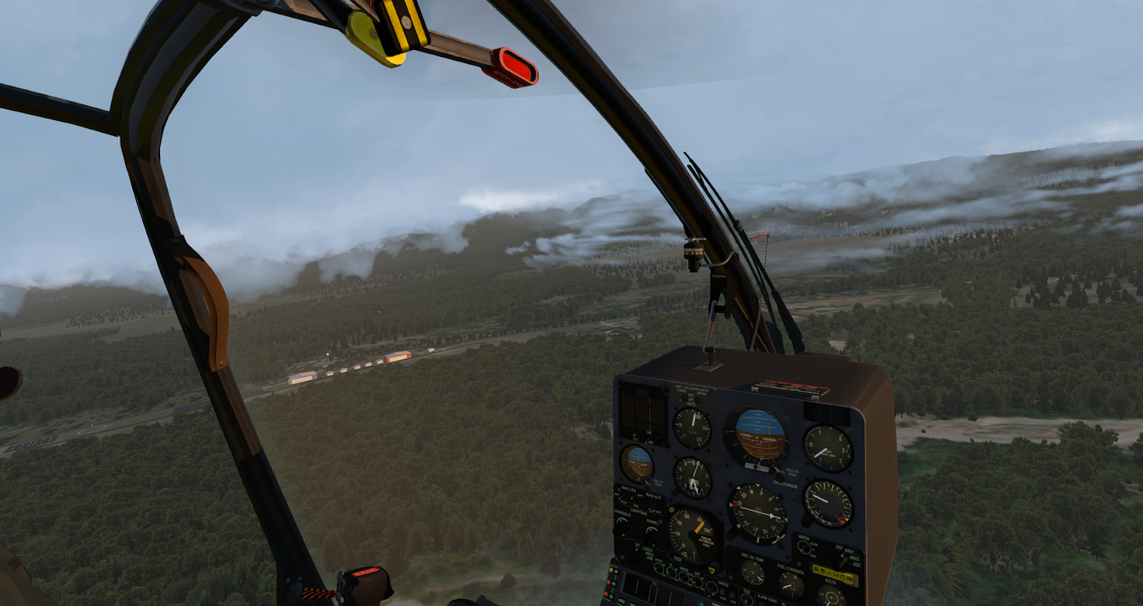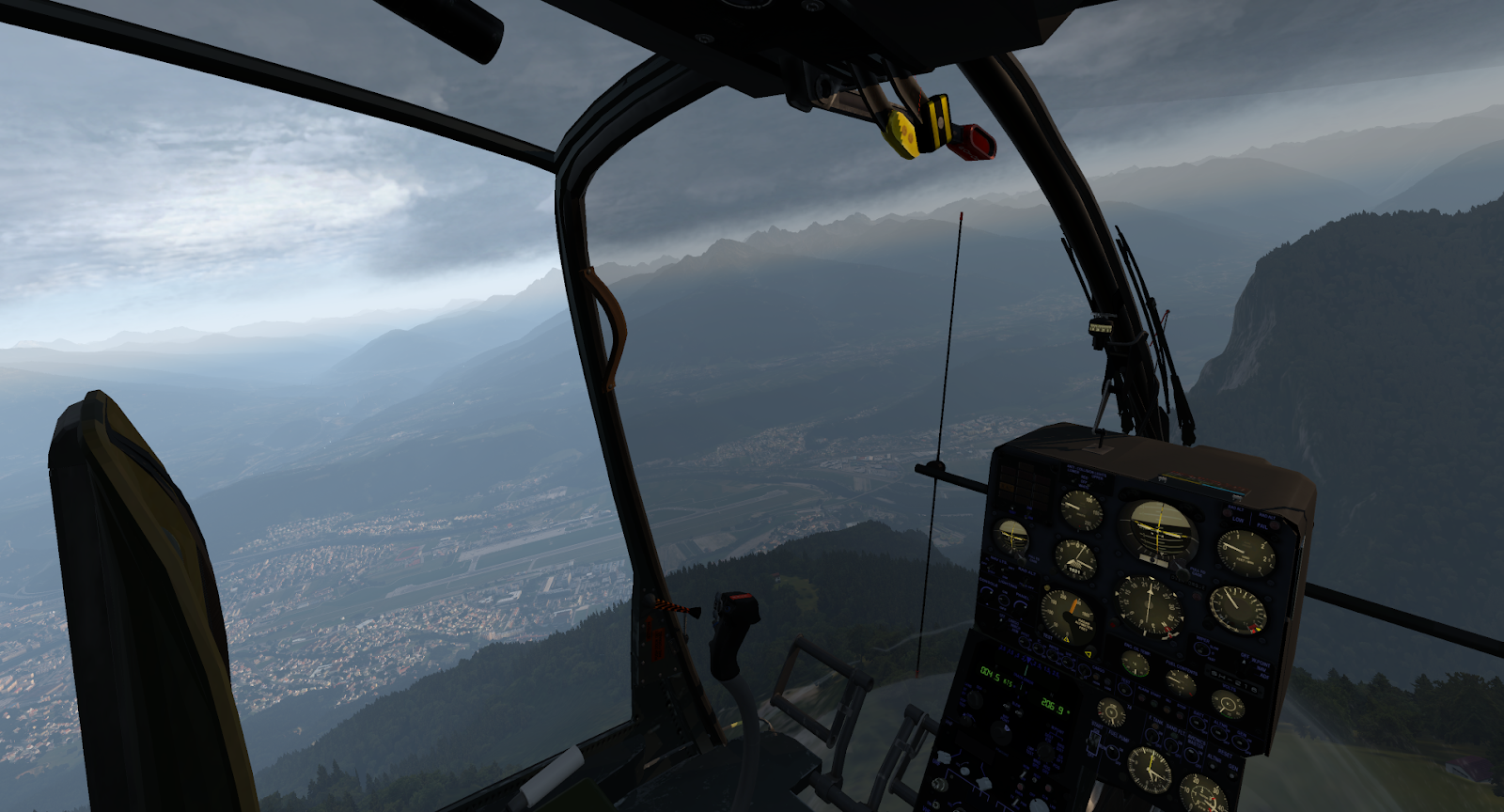 A notepad with checklists and reference sheets is clickable next to the center instrument console. I vastly prefer diegetic interfaces like this options panel and notepad to proprietary pop-up menus; they allow a pilot to maintain her immersion in the simulated world and help the aircraft feel alive and physical. Starting the Gazelle requires a few switches, a wait for turbine wind-up, and opening of the fuel flow lever; a studied pilot can raise her skids in 30 seconds. It will take more than 30 seconds to set up your radios if you plan on either communicating or navigating with them; this is standard with almost any aircraft, though Gazelle startup is otherwise so simple it somehow feels notable. Other than turbine ignition, there are switches for windshield wipers, lights, and basic avionics calibration, but the Gazelle is mostly autonomous in its management; you will need all your attention to fly it, anyways.