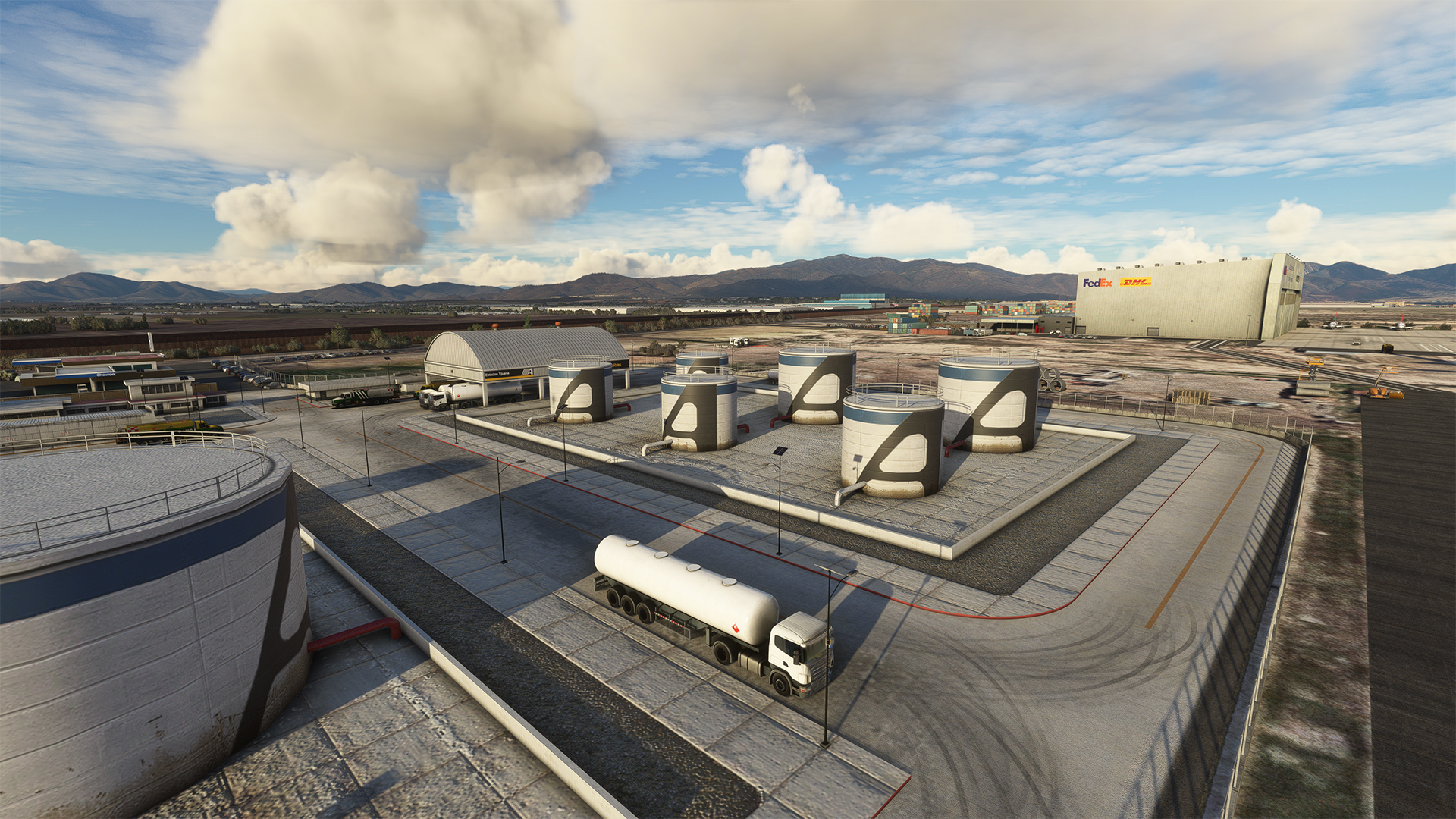 The scenery features an accurate rendition of the airport, with PBR textures, animated jetways, dynamic lighting, detailed hangars and buildings, custom ground textures, precise AFCAD, static aircraft and vehicles, animated radar facilities, native volumetric grass and vegetation, and more.