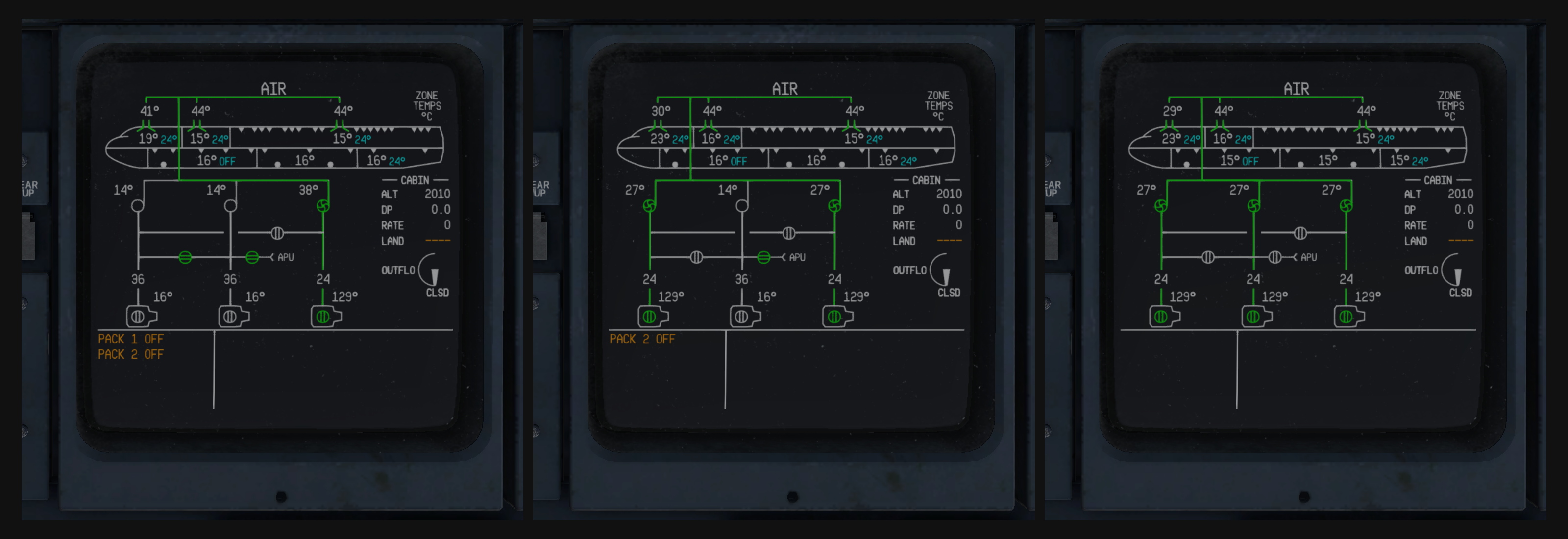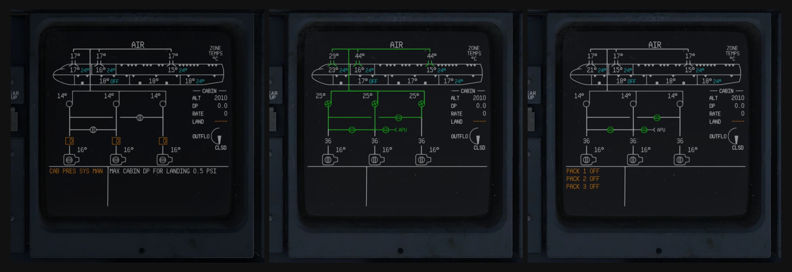 The image below shows the progression of the air system from cold and dark, to a state with the APU on with air conditioning, and then ready for engine start: