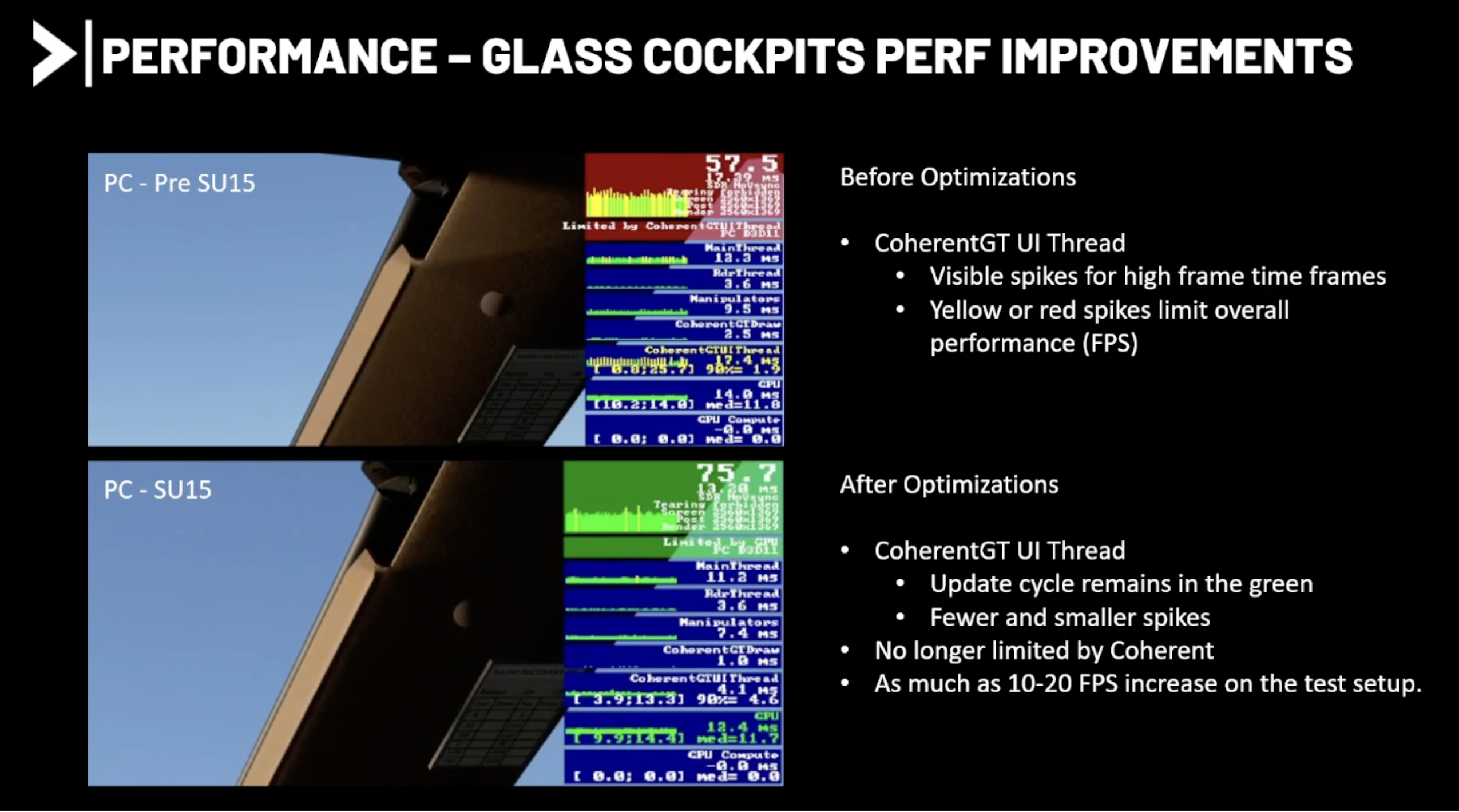 Starting off with Sim Update 15, the newest update to the simulator is slated to land on March 12th, with a public beta starting soon. The main focus for this update is improving performance, and especially with memory usage improvements. Working with Working Title Simulations, Microsoft and Asobo have been able to squeeze more performance out of the glass cockpits by reworking the CoherentGT thread, which is the process that renders glass cockpits, and is a common pitfall when it comes to performance with complex glass cockpit aircraft.