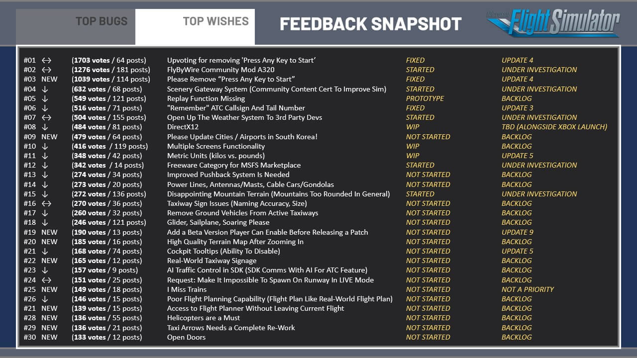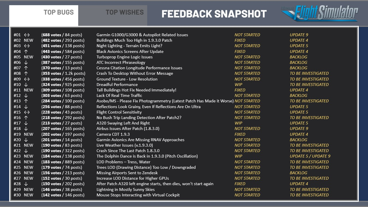 The top issue on the other hand – Garmin G1000/G3000 & Autopilot Related Issues – has yet to see any work start but is planned to be fixed in six updates’ time.