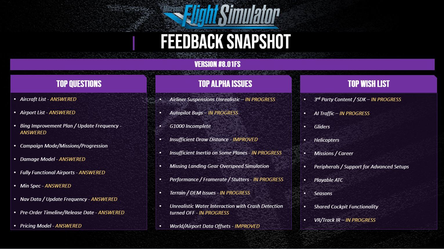 Lastly for this update, a new feedback snapshot was debuted, with a number of ‘answered’ and ‘improved’ tags added to areas addressed.