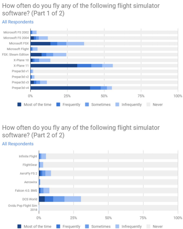 The highlight of this year’s survey is that X-Plane 11 is now as popular as Lockheed Martin’s Prepar3D, although this should be taken with a pinch of salt. X-Plane 11 has a slightly larger user base than that of Prepar3D, but Prepar3D V4 is the simulator used more frequently than any other simulator.